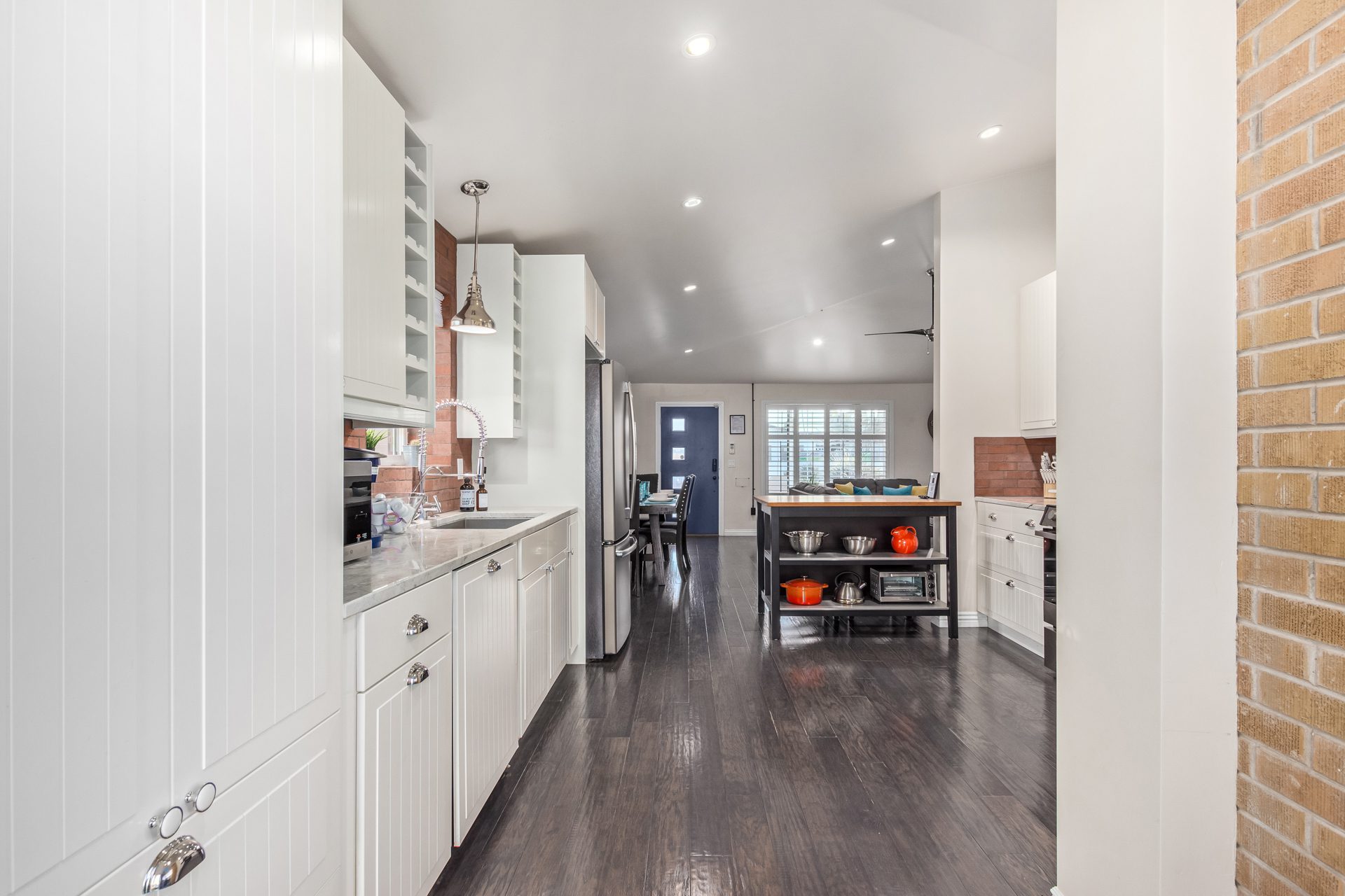 The open-concept layout flows naturally into a spacious dining area with seating for six, anchored by a striking gourmet kitchen designed for both form and function. Quartz countertops, brick accents, and a statement stove are paired with premium stainless-steel appliances, including a three-door refrigerator and dishwasher. A high-top island offers additional seating, while a full-size washer and dryer are conveniently tucked just off the kitchen.