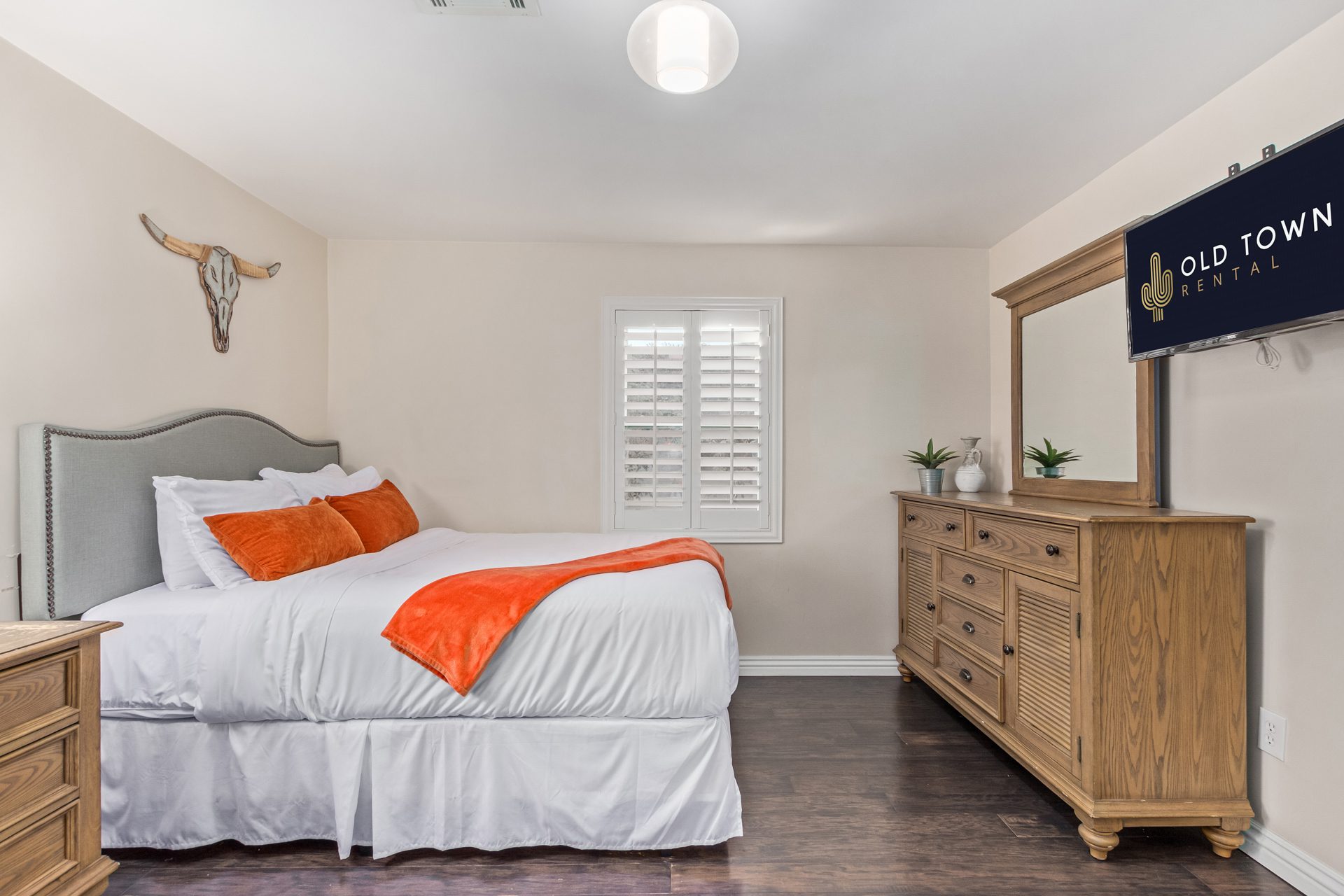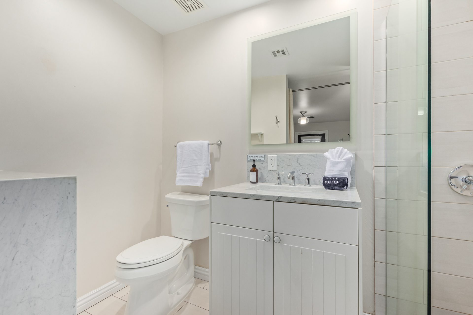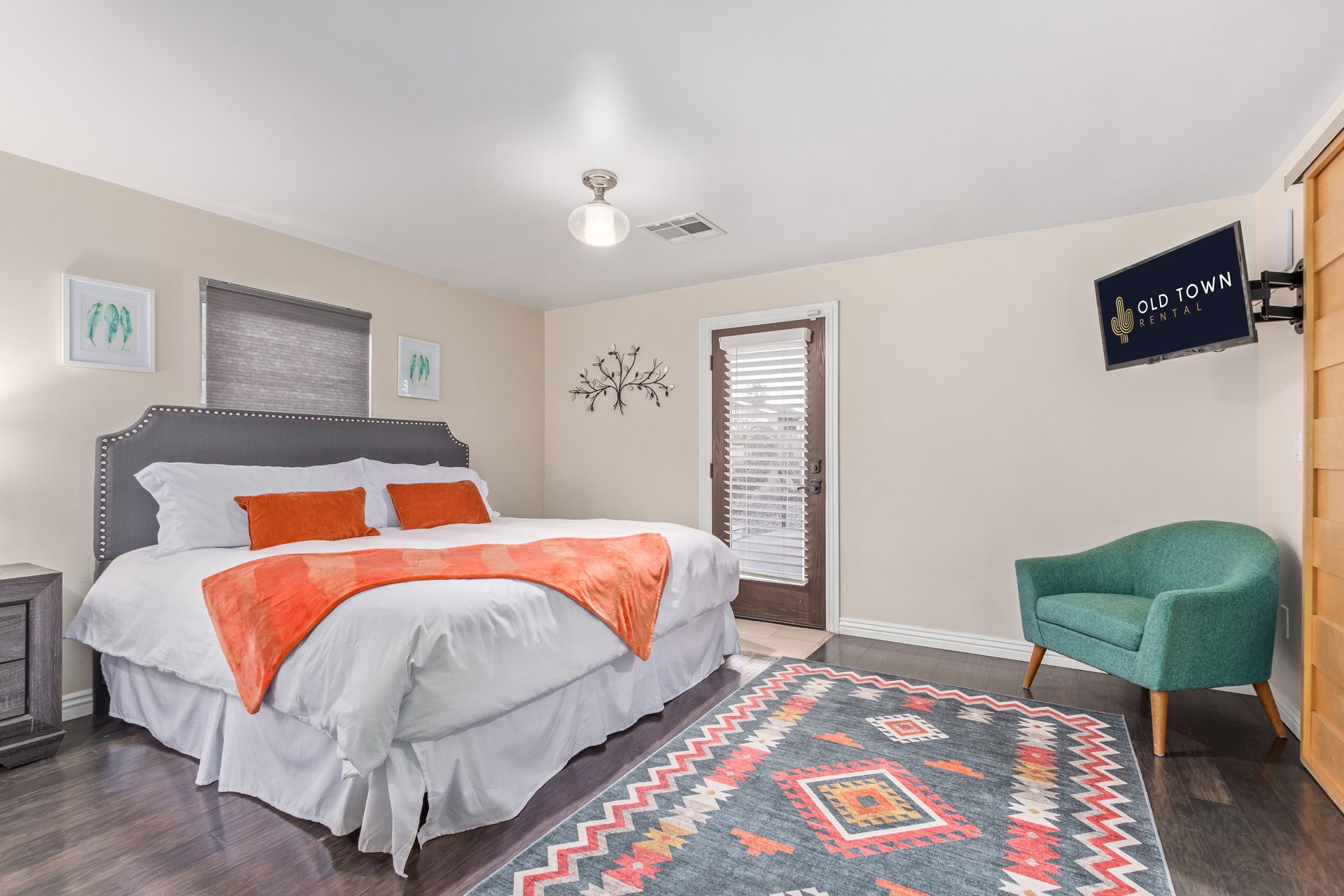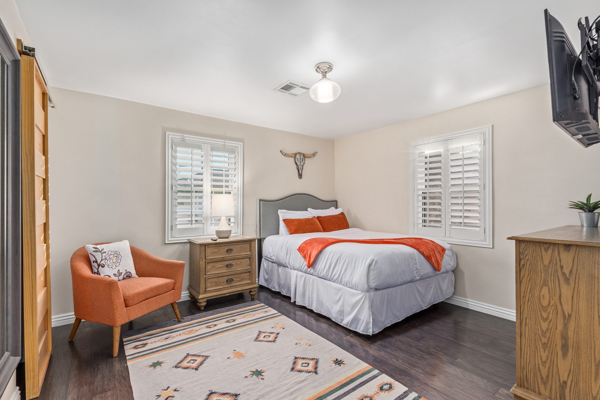 Just beyond the main living space, two oversized bedrooms provide a calm and private escape. The primary suite features a king bed dressed in hotel-quality linens, a comfortable lounge chair, a Smart TV, and a walk-in closet. The en-suite bathroom delivers a spa-like experience with elegant finishes, while private access to the backyard patio allows for easy indoor-outdoor living. Both interior bathrooms are finished with full tile and glass walk-in showers and polished quartz vanities.