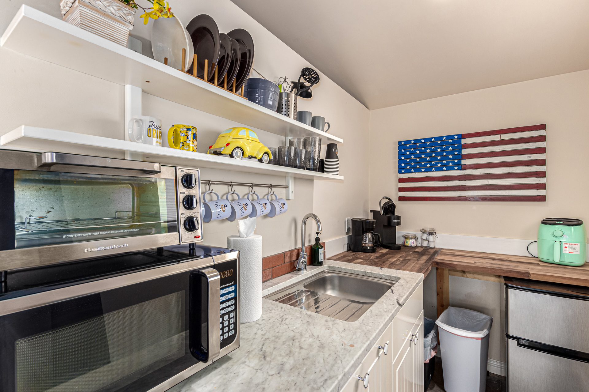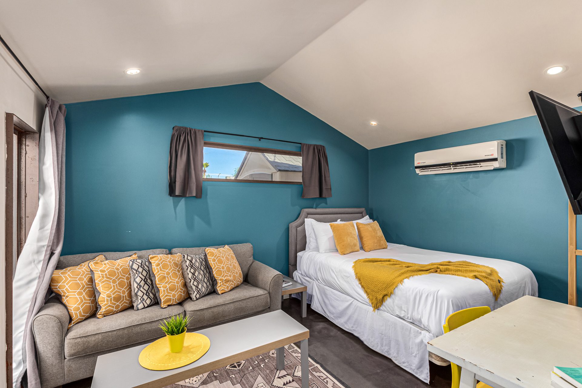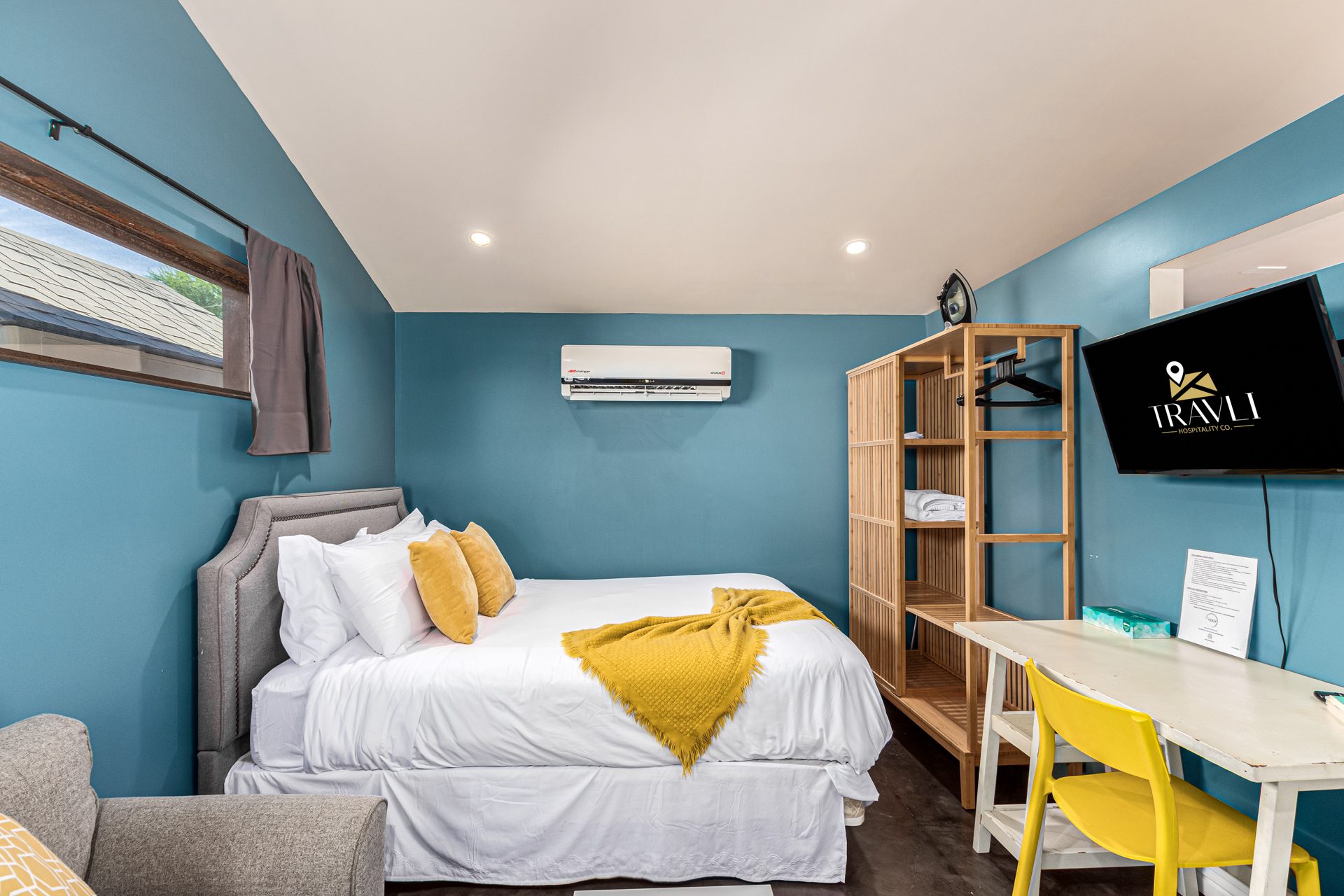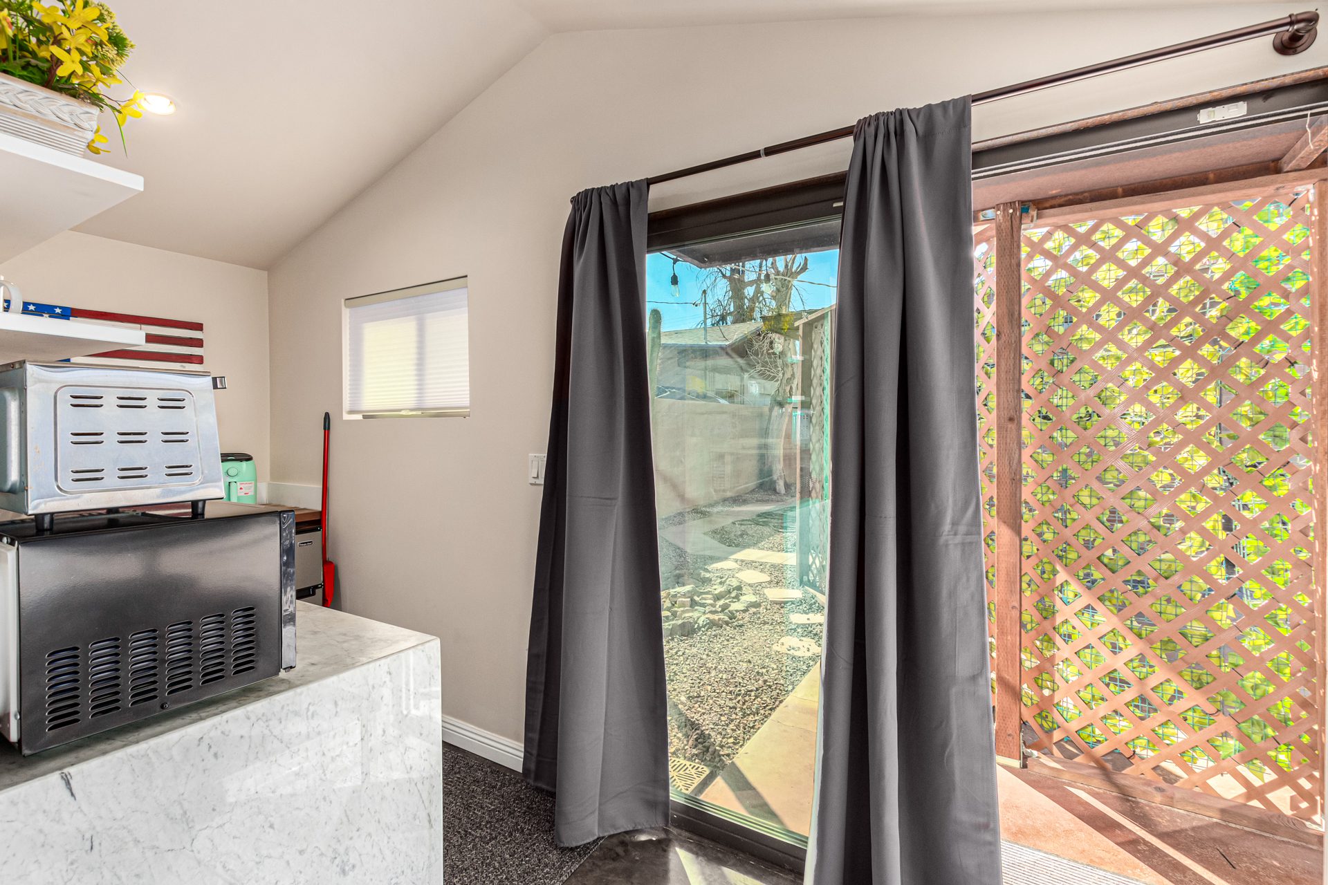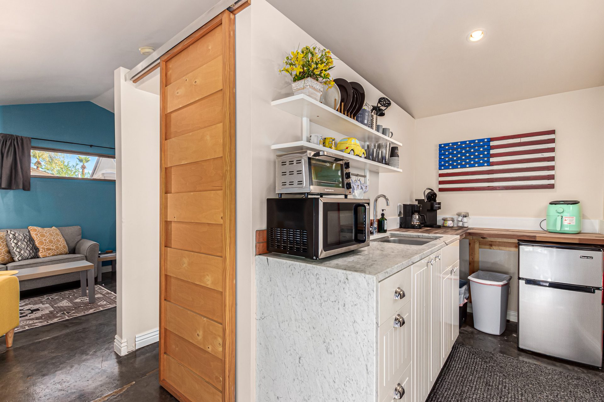 The detached guest house, or casita, mirrors the home’s modern aesthetic while offering complete privacy. Polished concrete floors, subtle pops of color, and a crisp contemporary design define the space. A thoughtfully equipped kitchenette includes a refrigerator, microwave, toaster oven, and coffee maker, while the luxury bathroom features an oversized walk-in shower with a rain-style shower head. A queen bed, sofa, wardrobe storage, and dedicated work desk make the casita ideal for extended stays, guests, or a quiet work-from-home retreat.