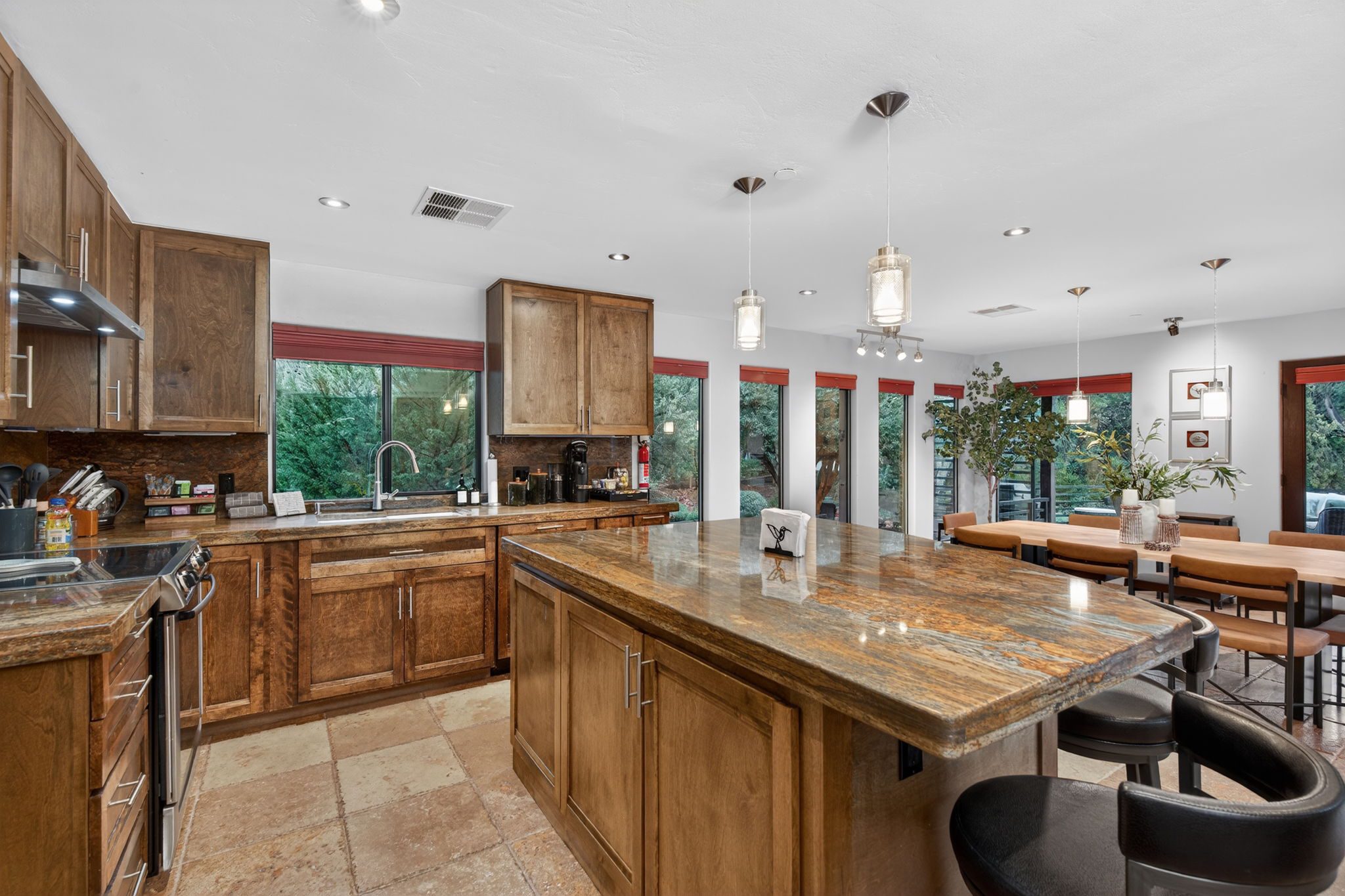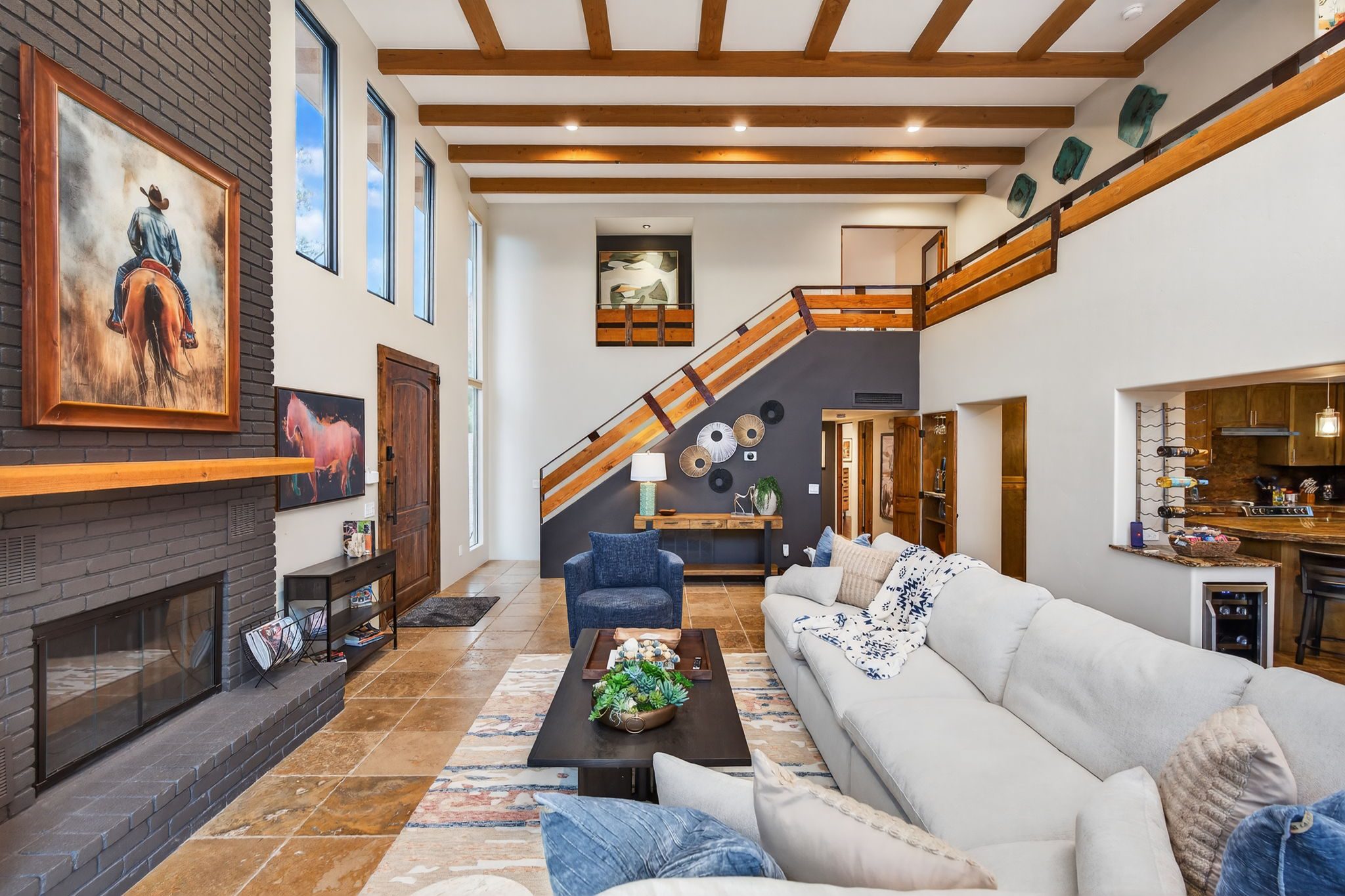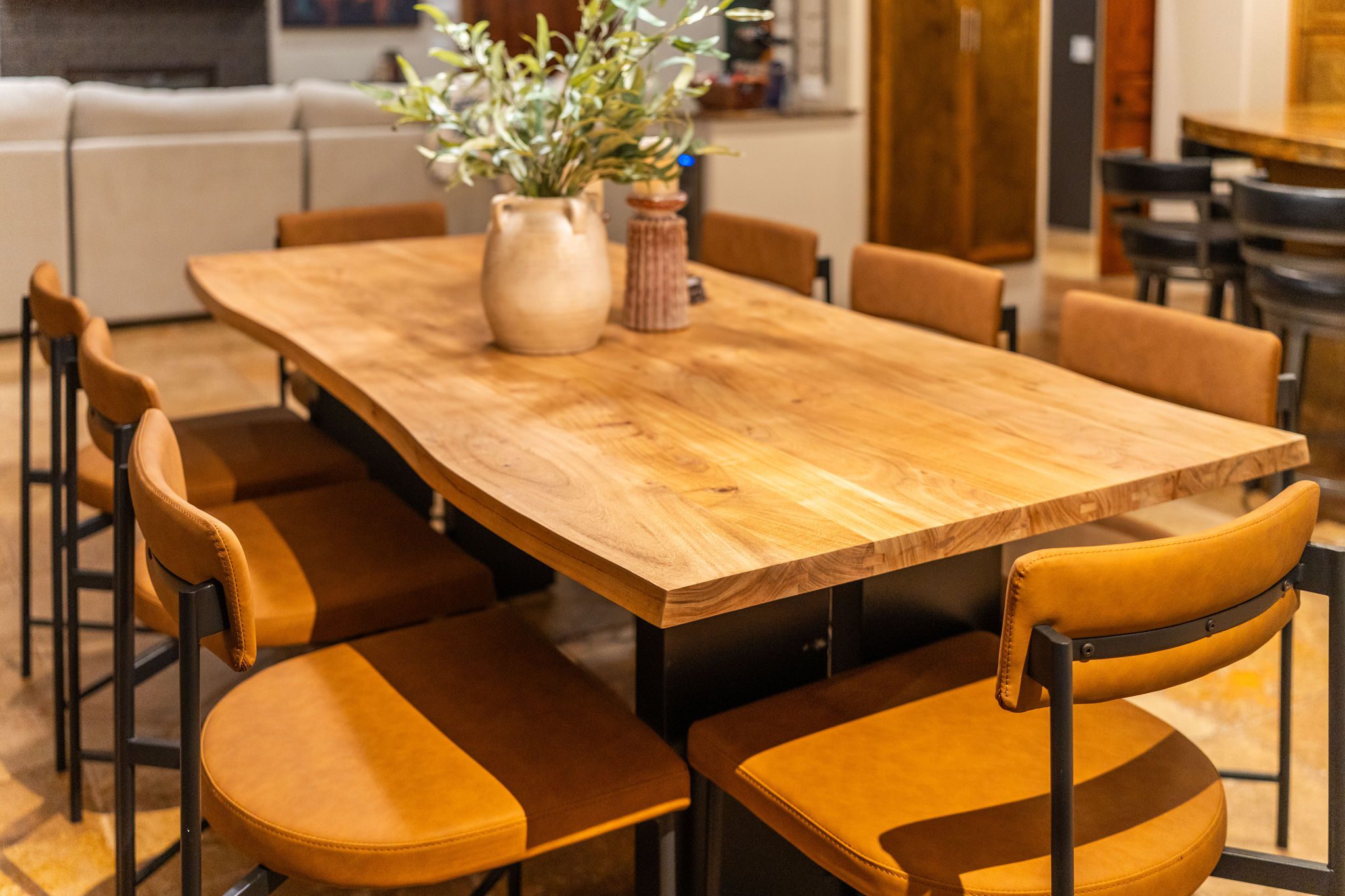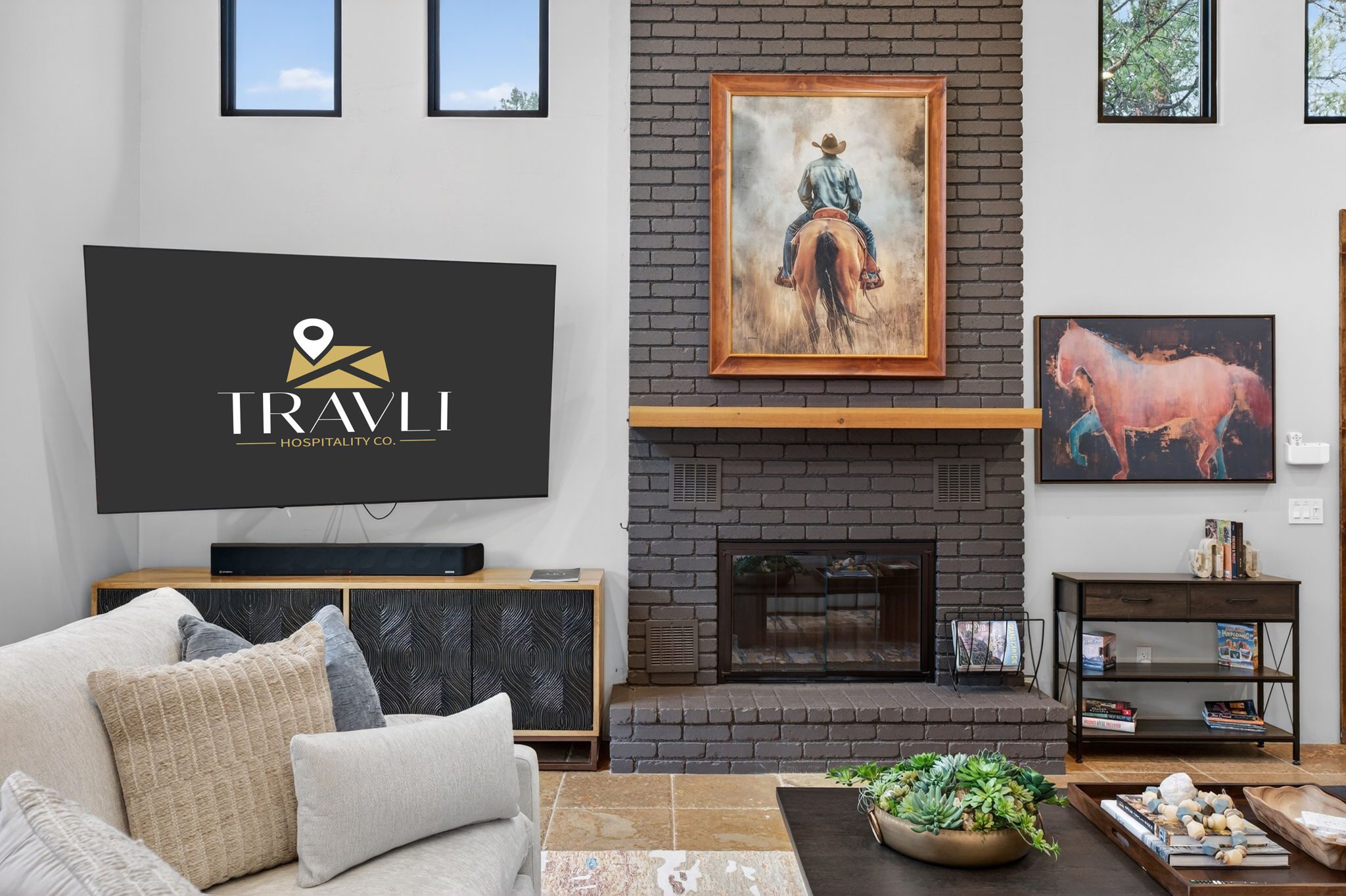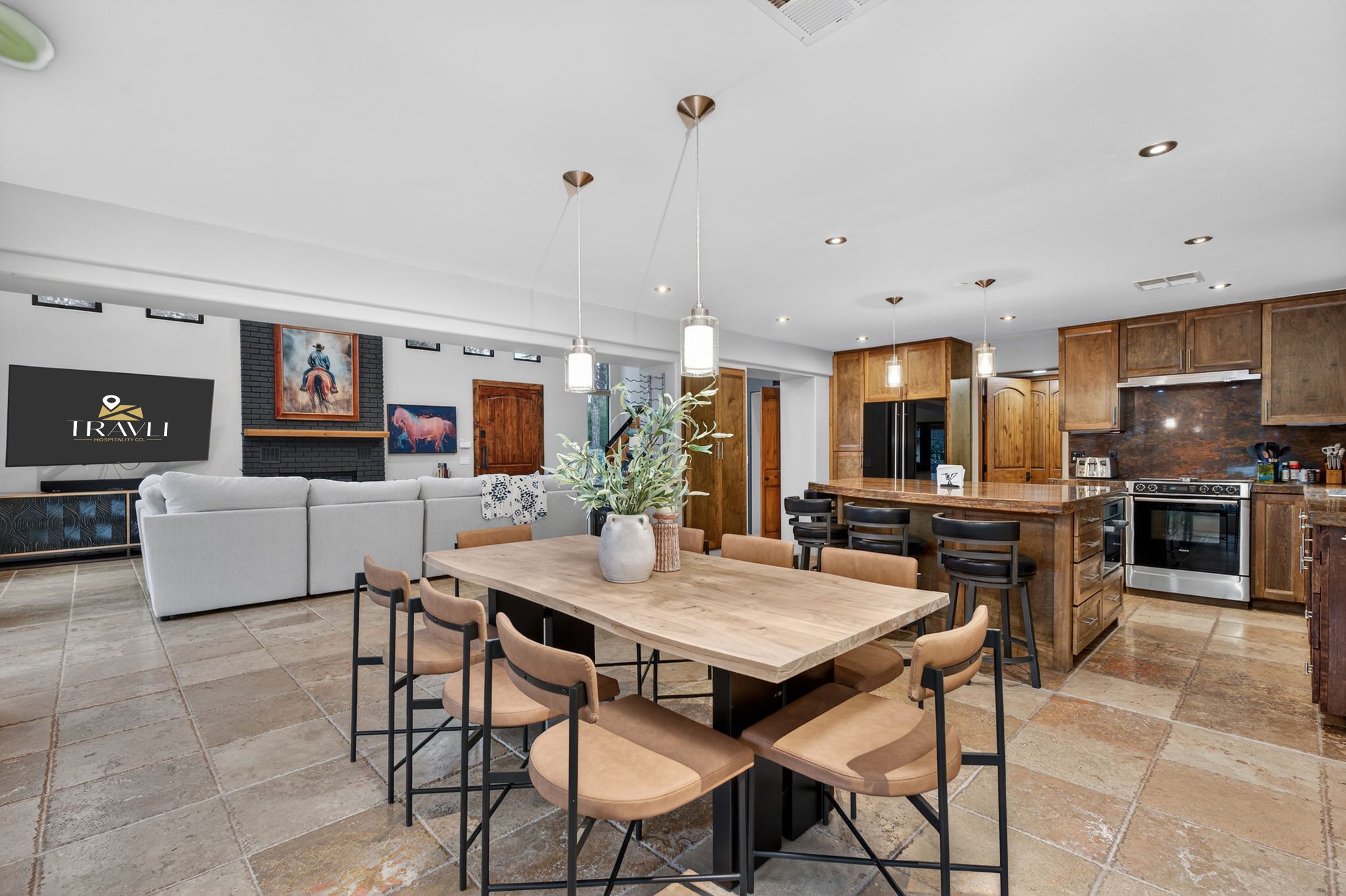 The living space is designed to impress without sacrificing comfort, anchored by an oversized sectional, a wood-burning fireplace, soaring vaulted ceilings, and an 85” Smart TV framed by playful, modern Southwest styling. The chef’s kitchen features rich dark wood cabinetry, updated appliances, and every small appliance you could need to host with ease, while the dining area for up to eight overlooks the expansive back patio and invites long, lingering meals surrounded by nature.