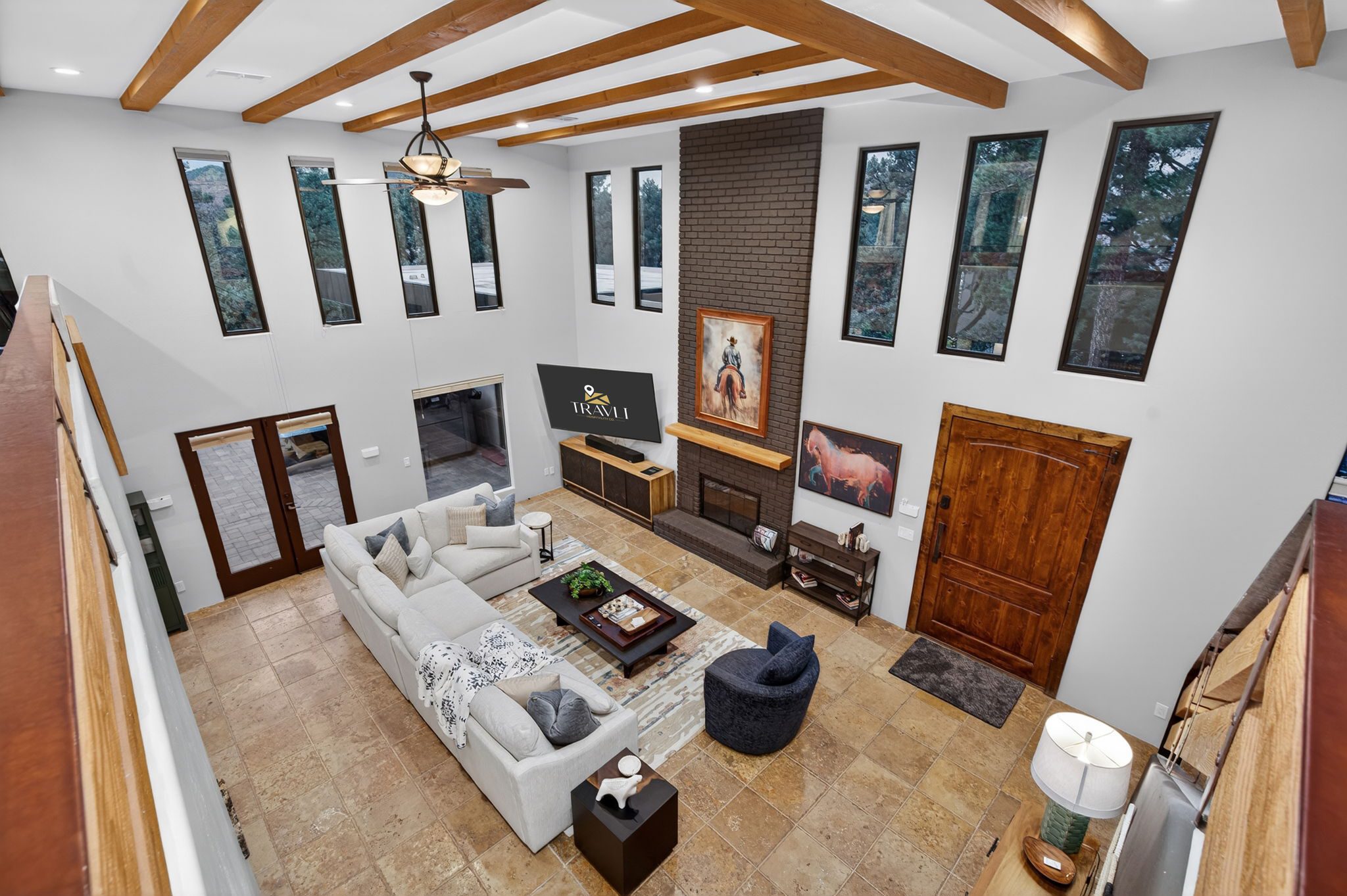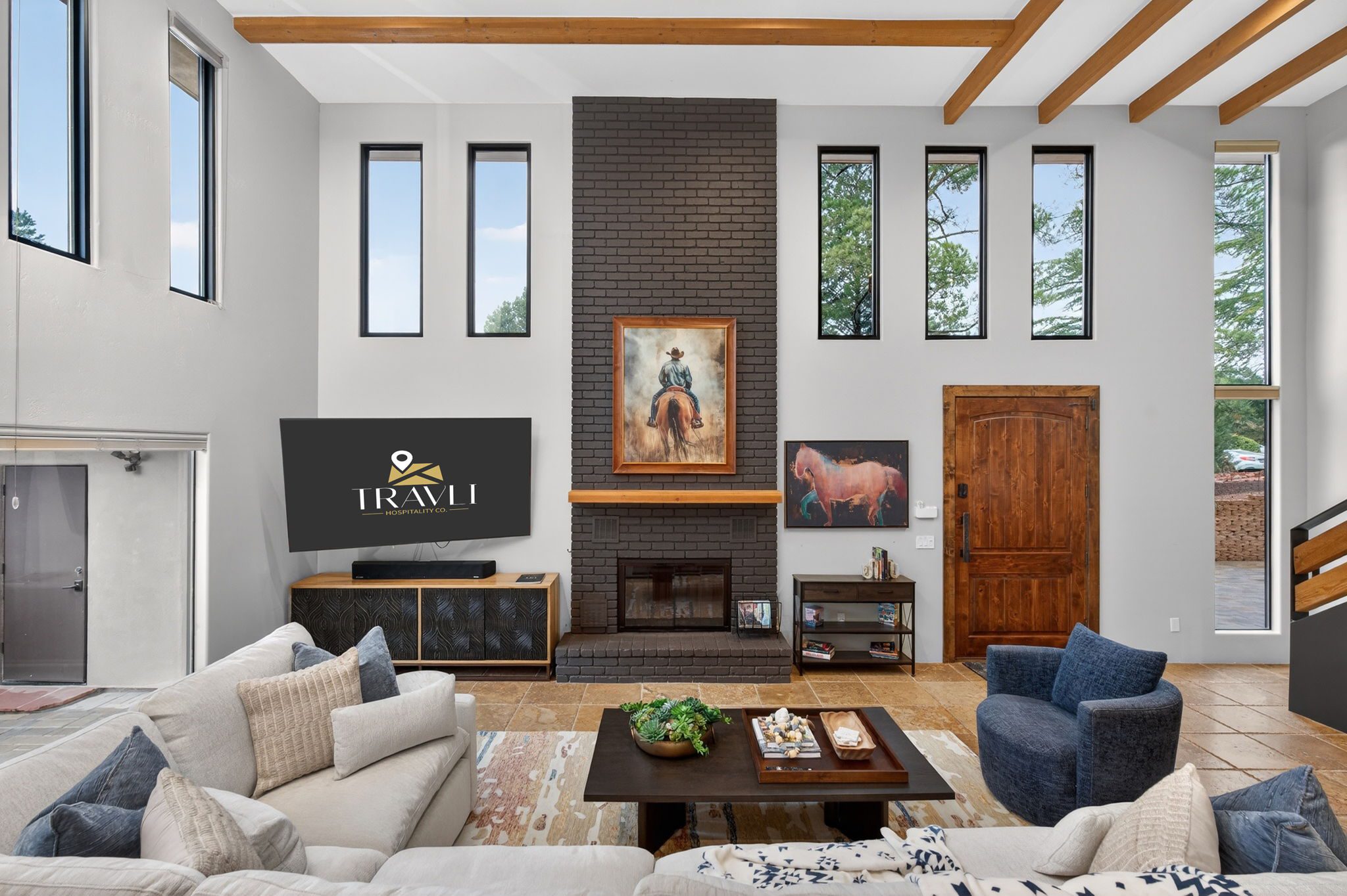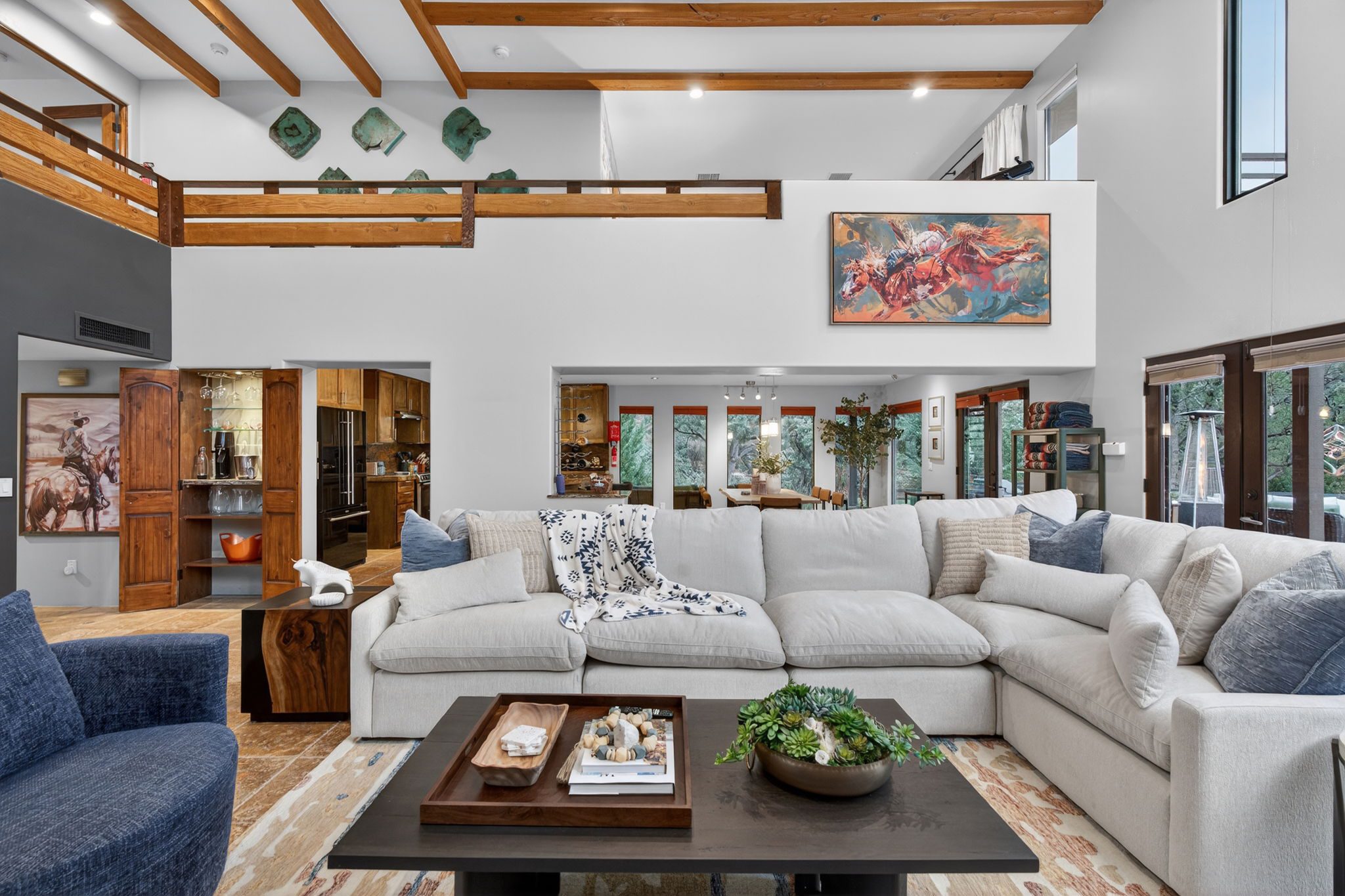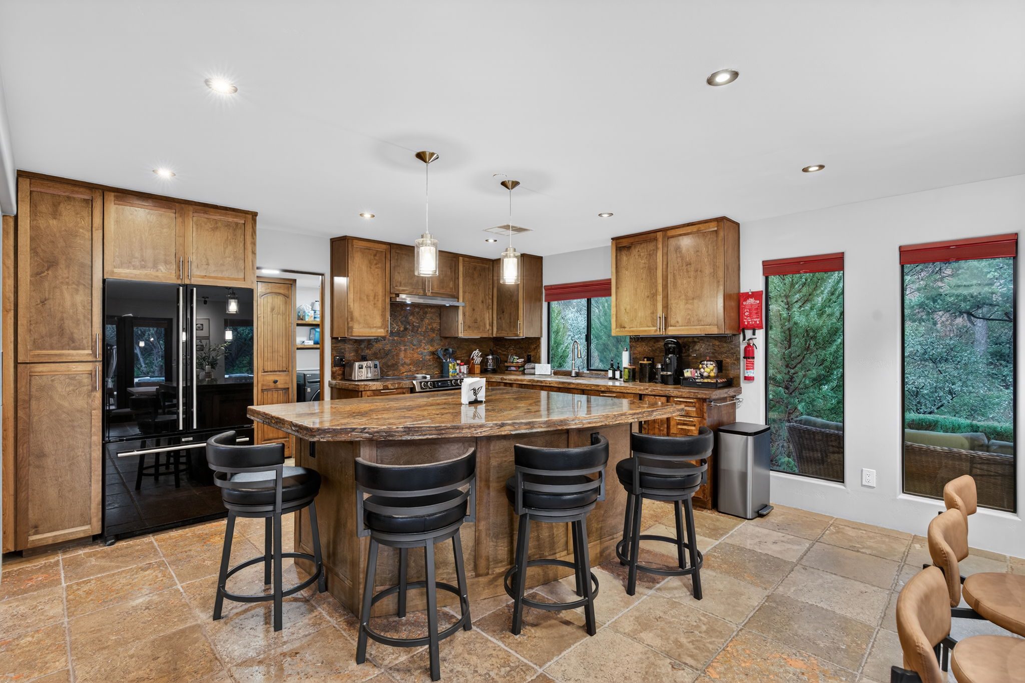 The living space is designed to impress without sacrificing comfort, anchored by an oversized sectional, a wood-burning fireplace, soaring vaulted ceilings, and an 85” Smart TV framed by playful, modern Southwest styling. The chef’s kitchen features rich dark wood cabinetry, updated appliances, and every small appliance you could need to host with ease, while the dining area for up to eight overlooks the expansive back patio and invites long, lingering meals surrounded by nature.