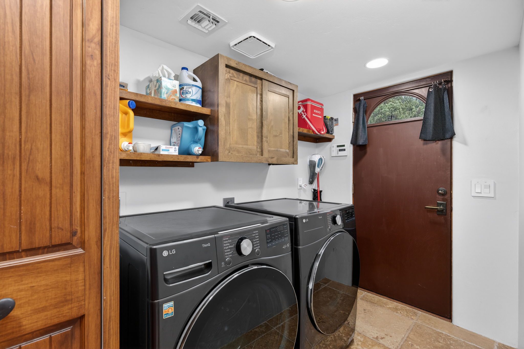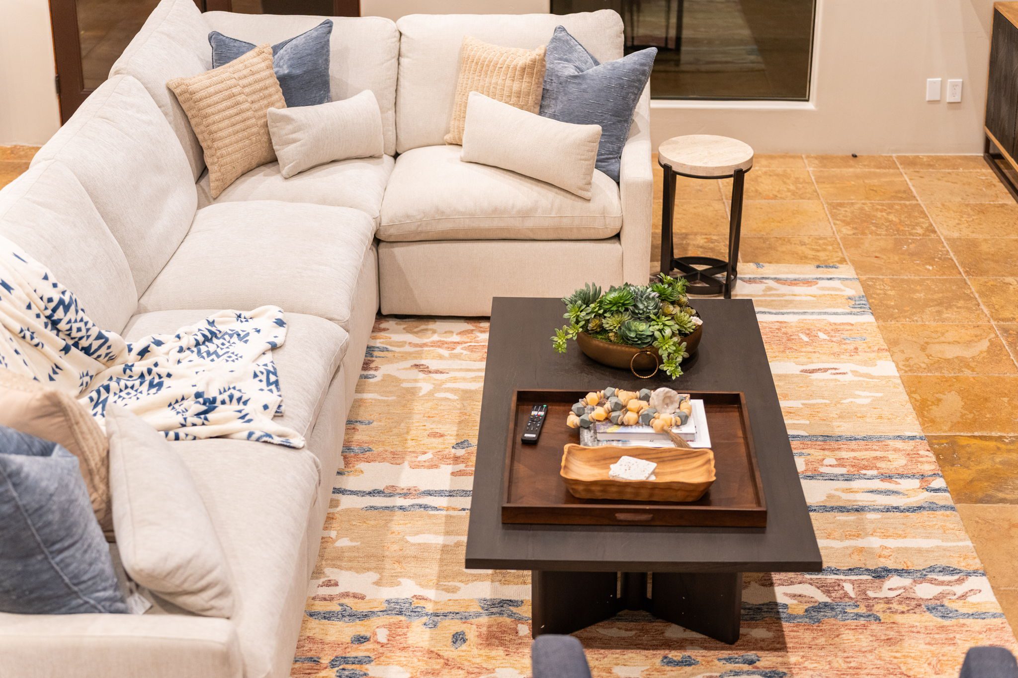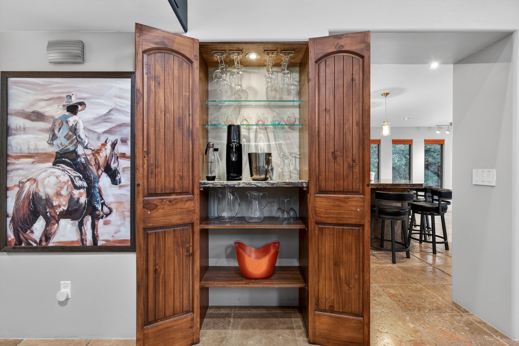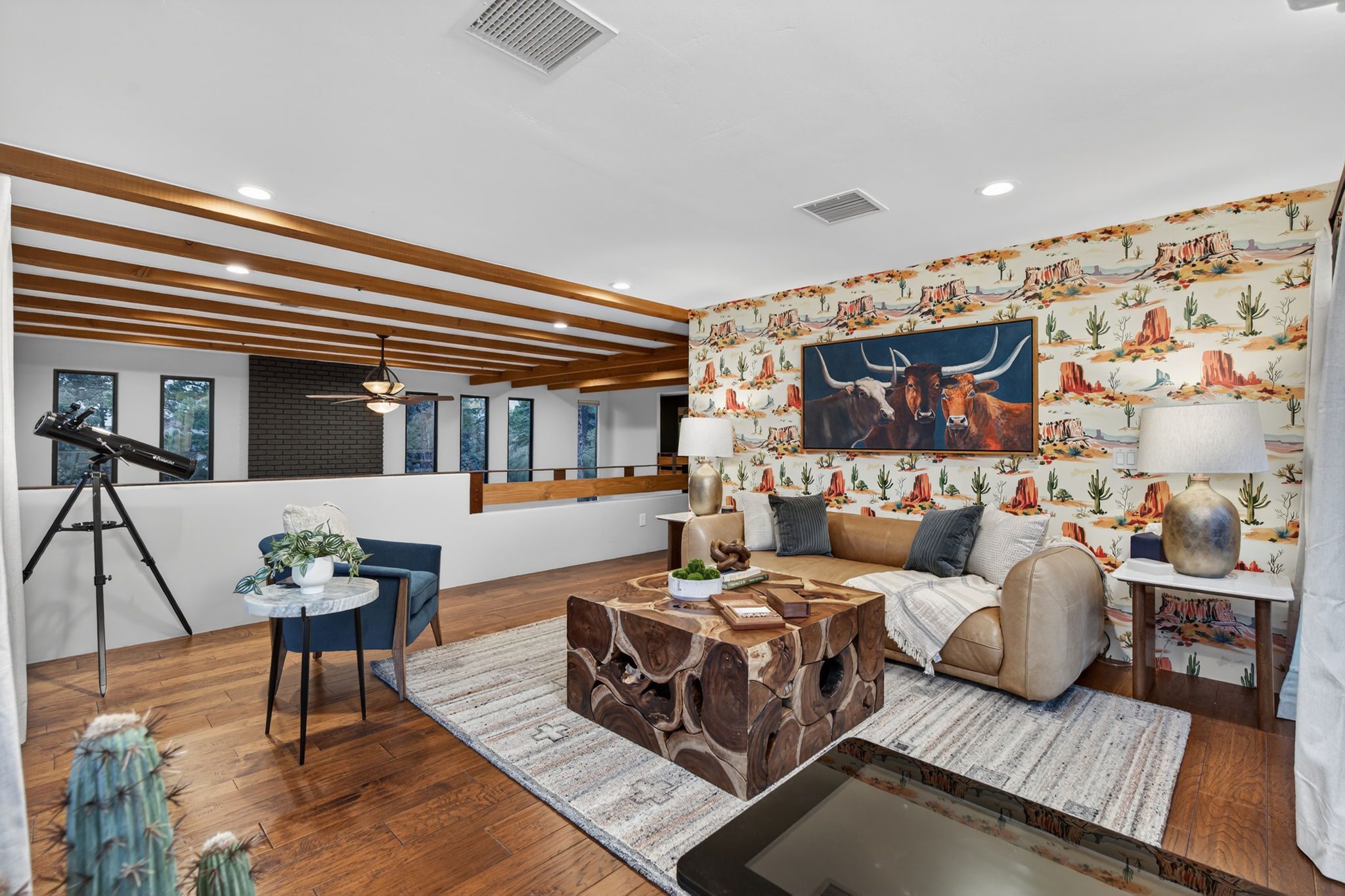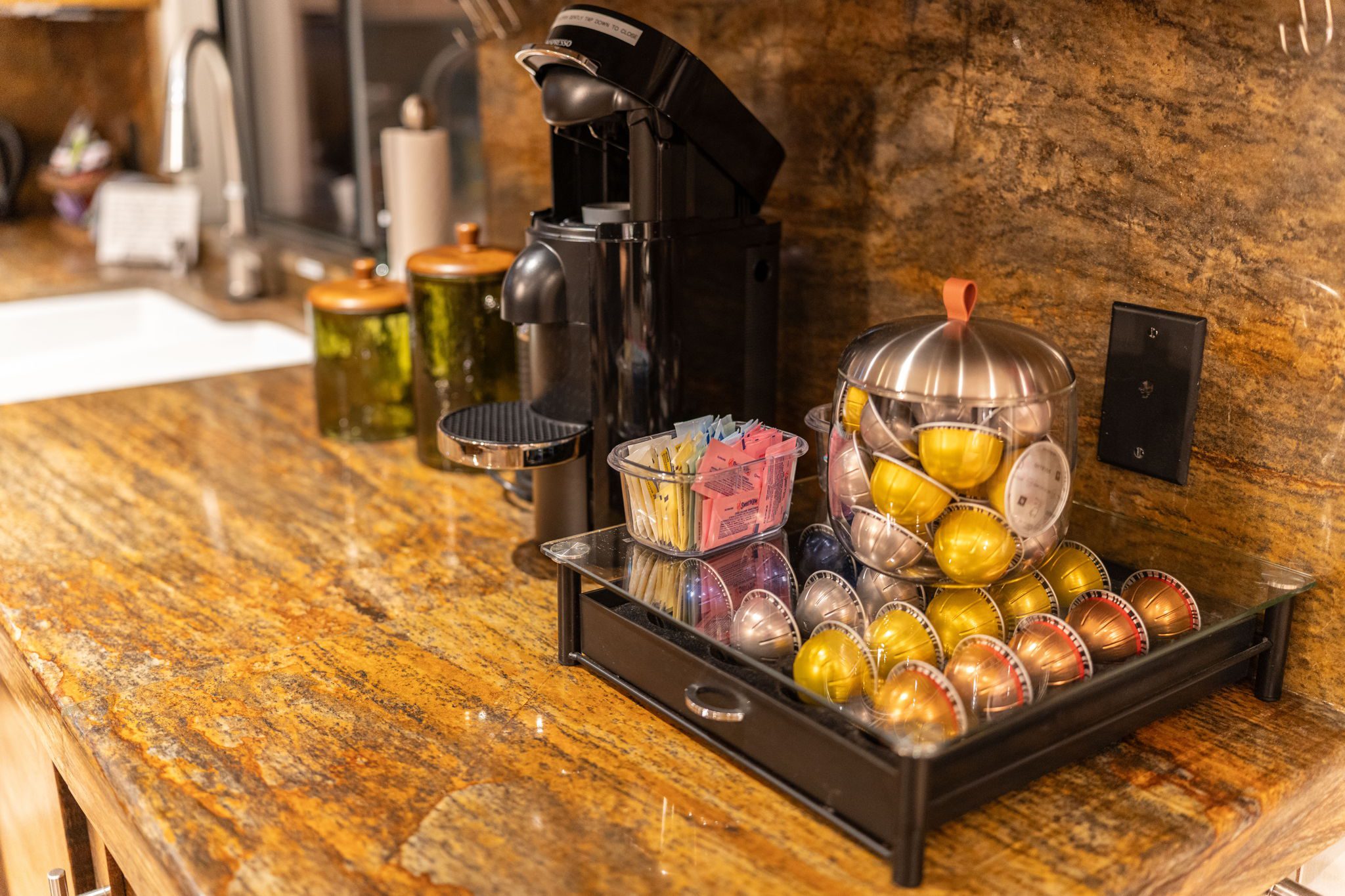 The living space is designed to impress without sacrificing comfort, anchored by an oversized sectional, a wood-burning fireplace, soaring vaulted ceilings, and an 85” Smart TV framed by playful, modern Southwest styling. The chef’s kitchen features rich dark wood cabinetry, updated appliances, and every small appliance you could need to host with ease, while the dining area for up to eight overlooks the expansive back patio and invites long, lingering meals surrounded by nature.