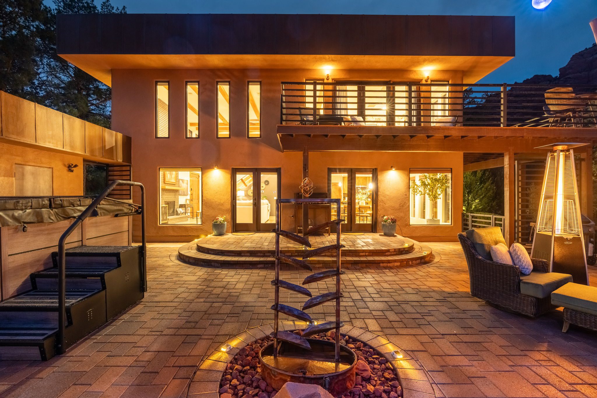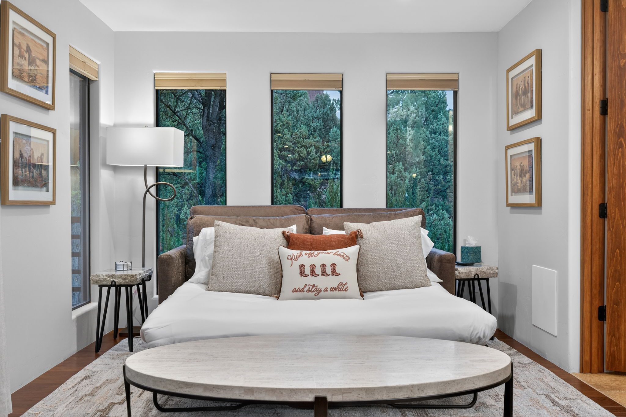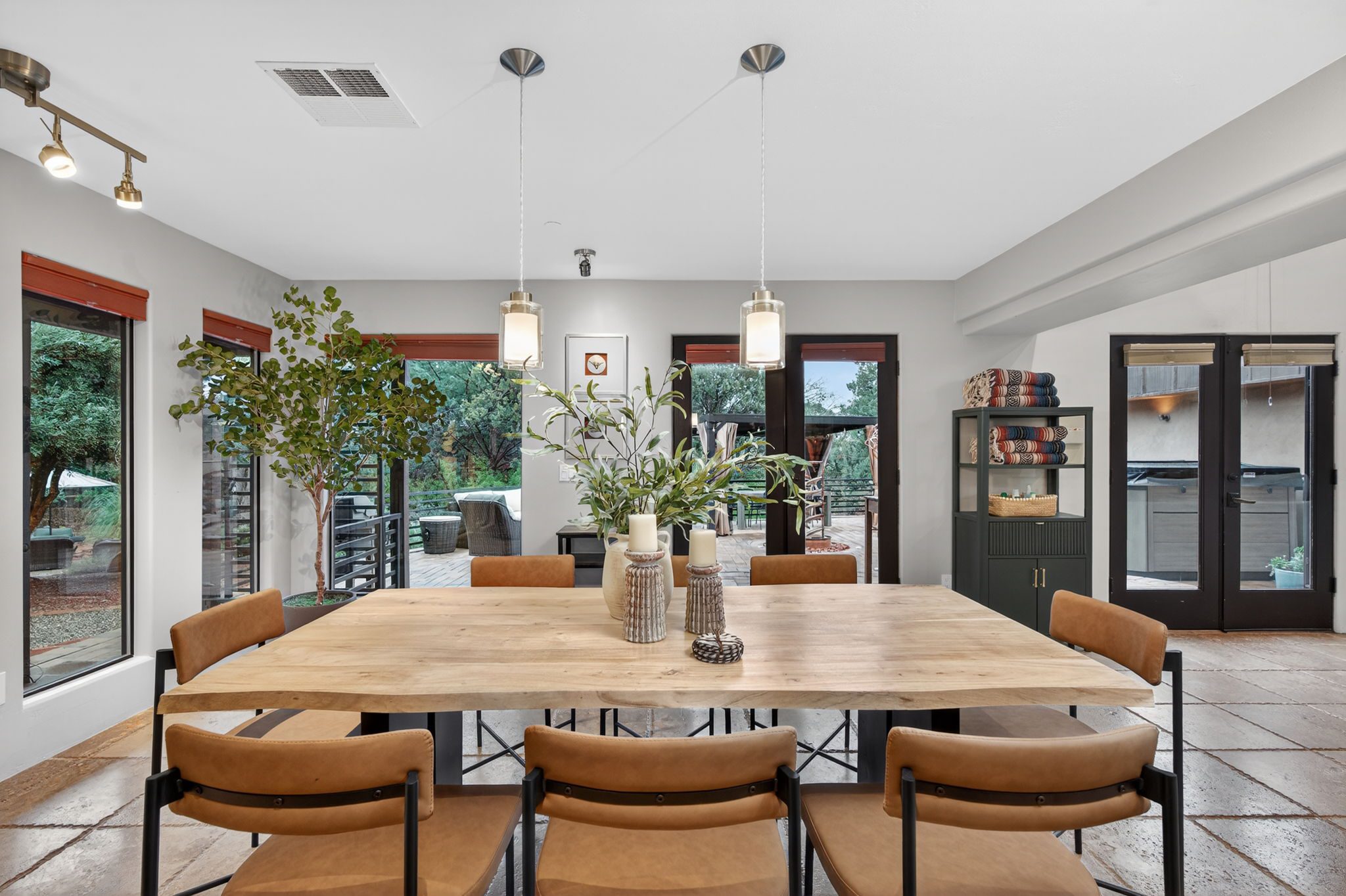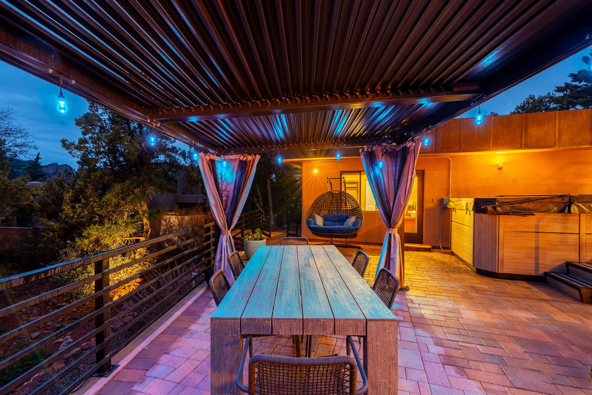 The true crown jewel of the property is the private backyard retreat, an outdoor oasis designed for unforgettable Sedona evenings. Multiple lounge areas surround an oversized sectional and fire pit, while a louvered pergola shades the outdoor dining space beside a tranquil water feature. The brand-new 13-foot swim spa steals the show, seating up to thirteen guests and offering a powerful swim-current feature for those who want to turn relaxation into recreation. The wooded grounds extend beyond the main patio with hidden seating nooks and tucked-away garden spaces, inviting you to wander and discover your own perfect perch for morning coffee or a quiet glass of wine at dusk.