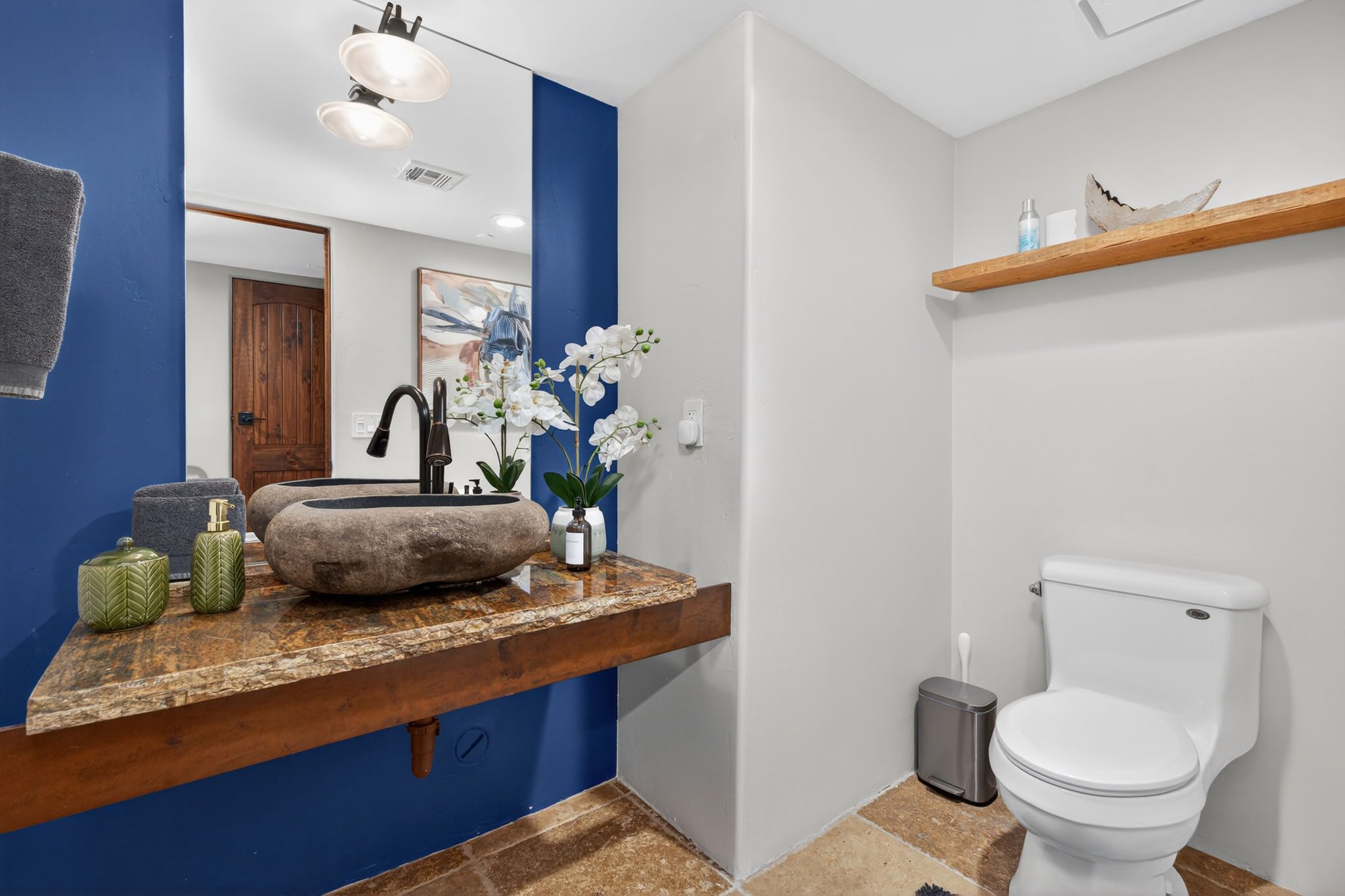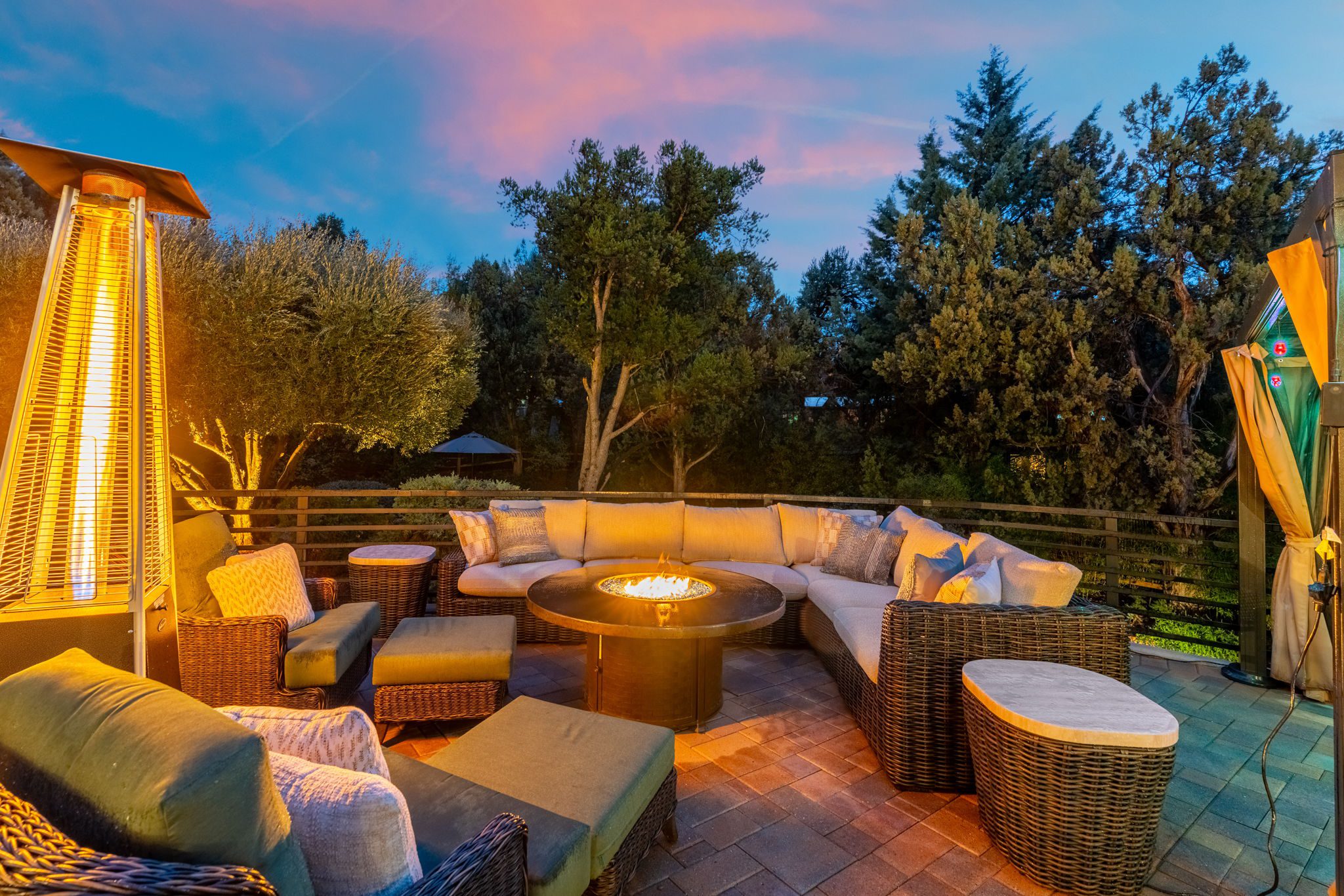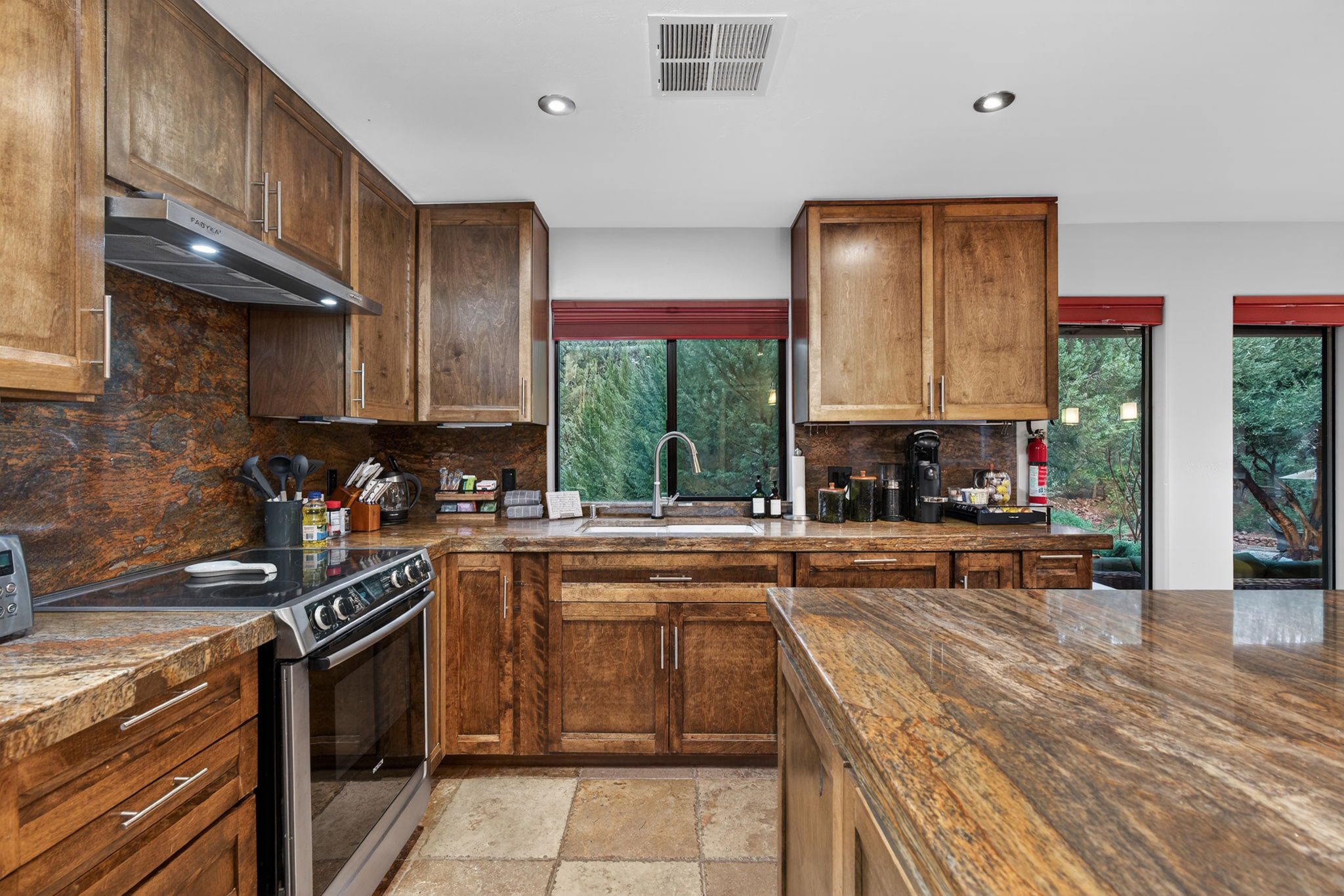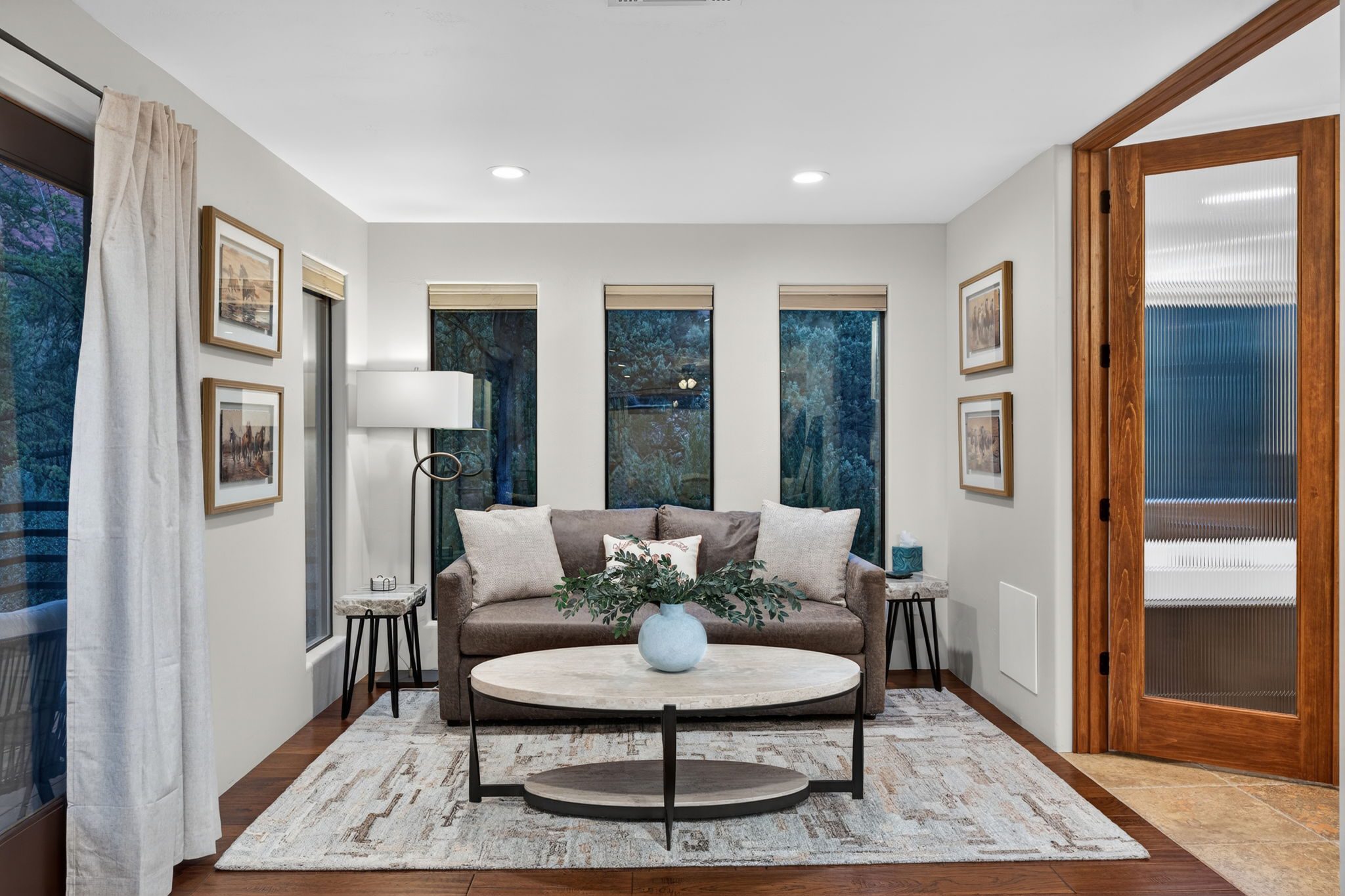 The true crown jewel of the property is the private backyard retreat, an outdoor oasis designed for unforgettable Sedona evenings. Multiple lounge areas surround an oversized sectional and fire pit, while a louvered pergola shades the outdoor dining space beside a tranquil water feature. The brand-new 13-foot swim spa steals the show, seating up to thirteen guests and offering a powerful swim-current feature for those who want to turn relaxation into recreation. The wooded grounds extend beyond the main patio with hidden seating nooks and tucked-away garden spaces, inviting you to wander and discover your own perfect perch for morning coffee or a quiet glass of wine at dusk.