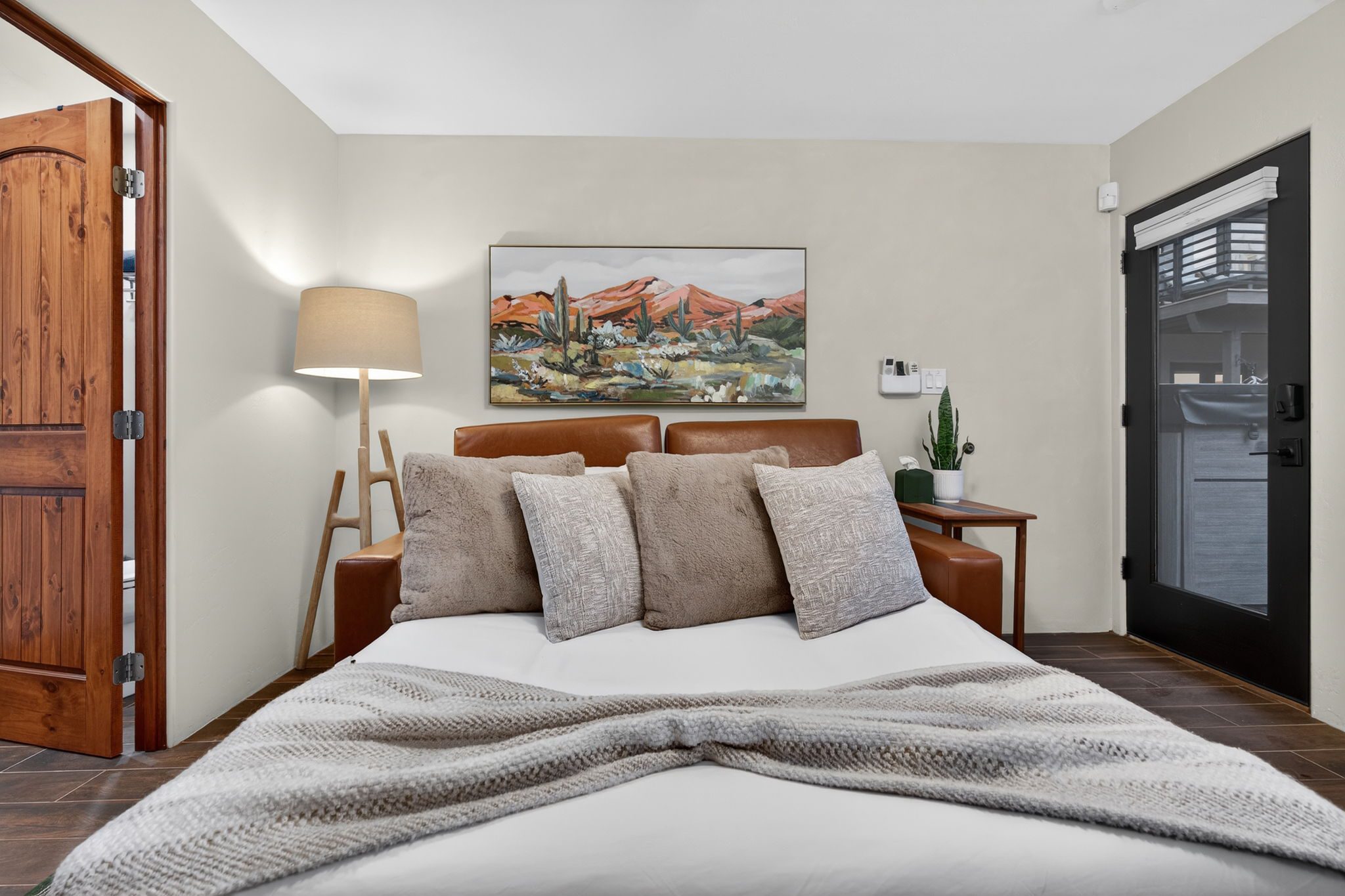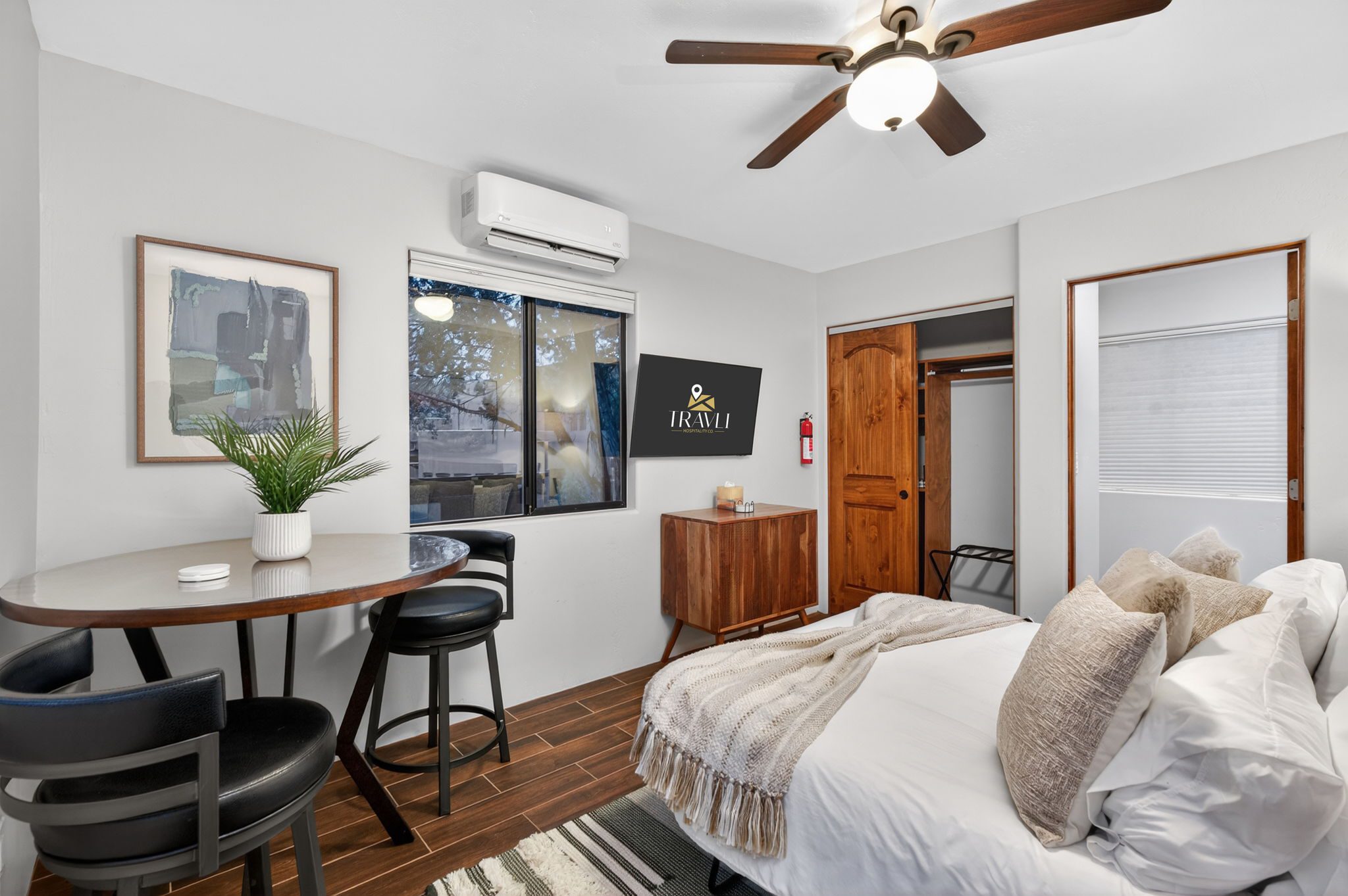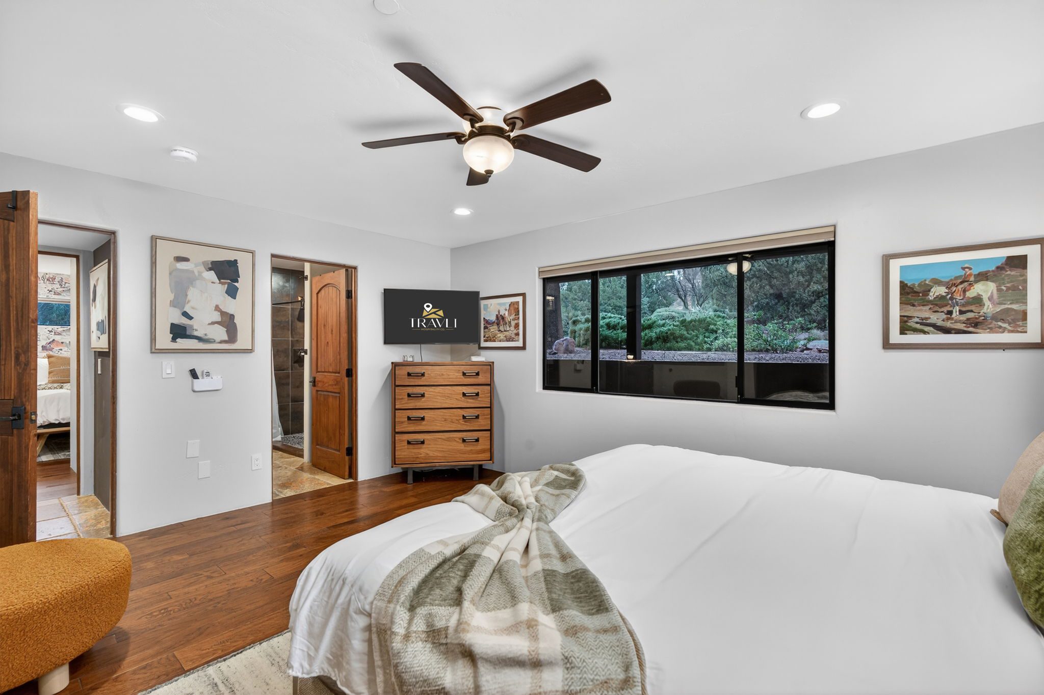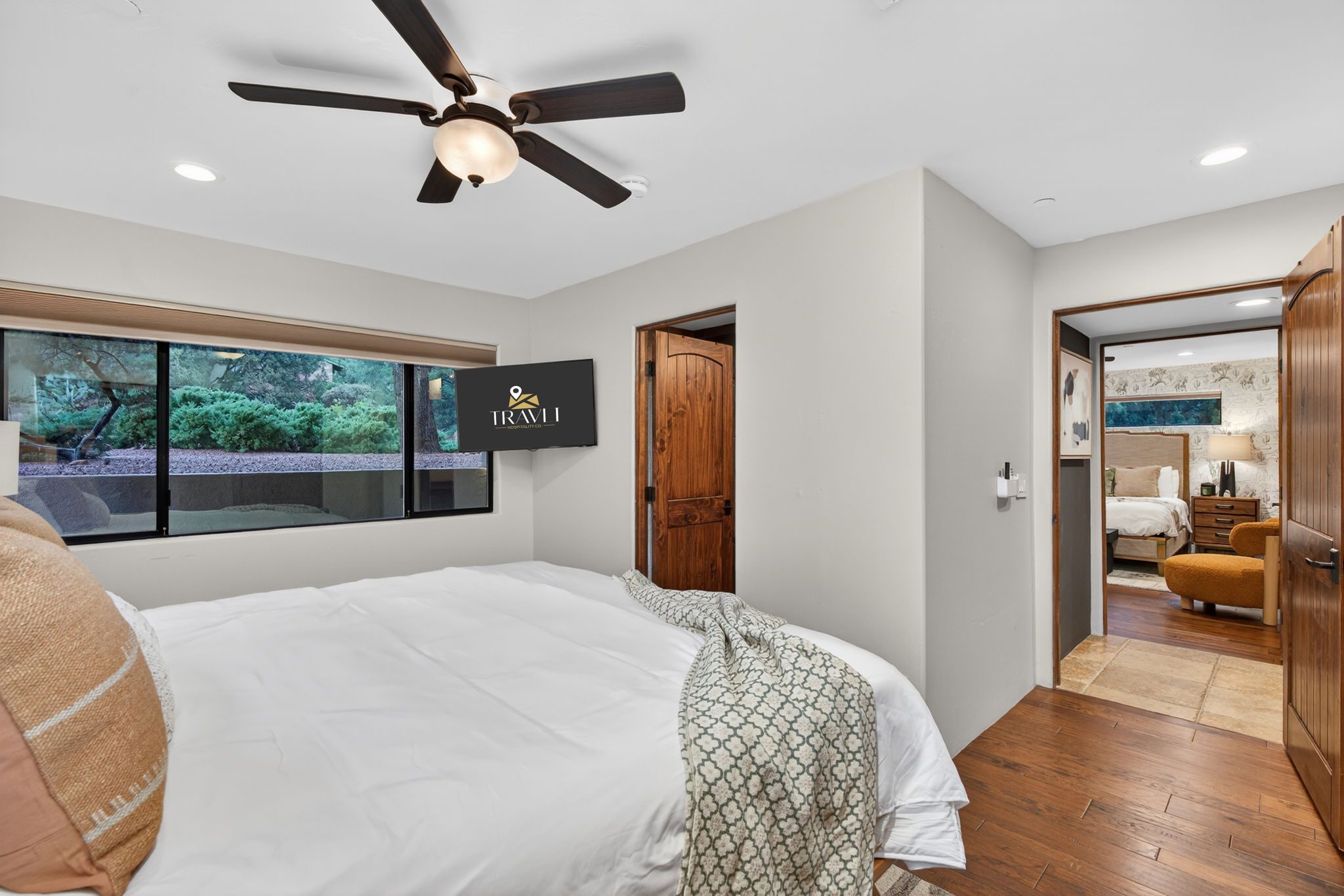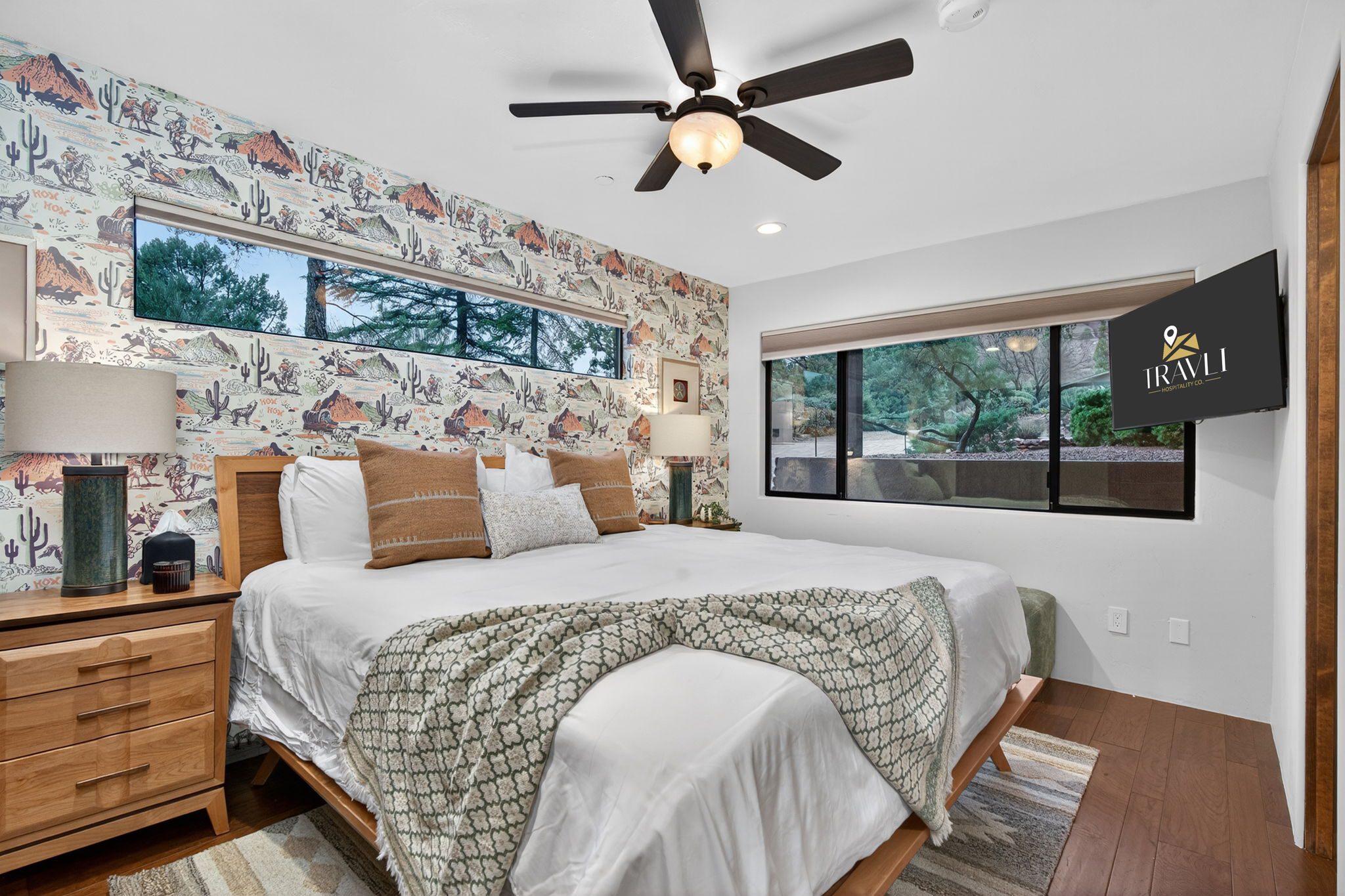 Location elevates this retreat even further. The Chapel of the Holy Cross is just an easy eight-minute walk away, letting you skip the parking crowds and experience one of Sedona’s most iconic landmarks on foot—or simply enjoy the breathtaking view from your bed or private balcony. Whether you’re gathering under the stars around the fire pit, floating in the swim spa as the red rocks glow at sunset, or waking to the Chapel framed perfectly beyond your window, The Chapel Garden Retreat delivers a Sedona experience that feels both cinematic and deeply personal.
