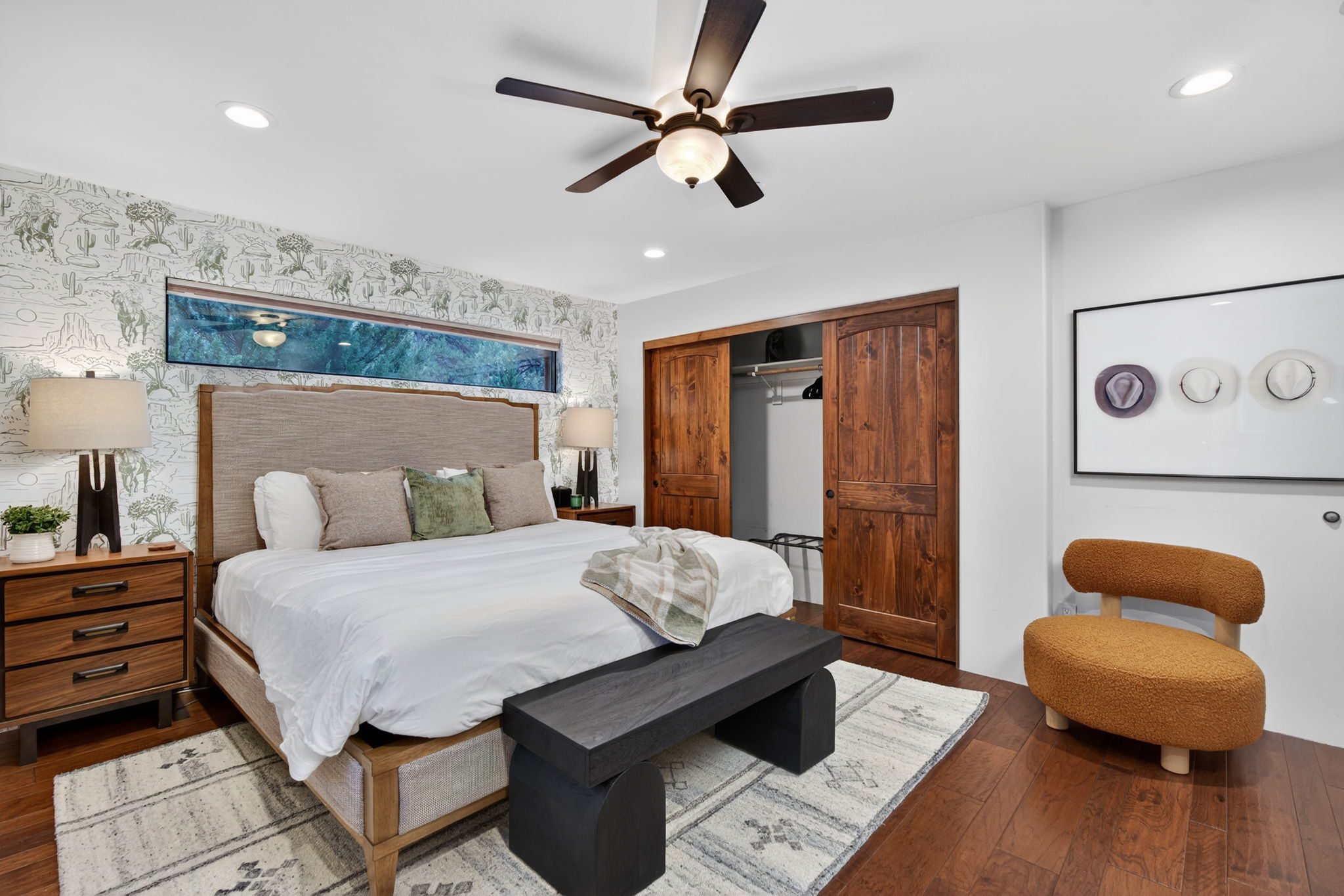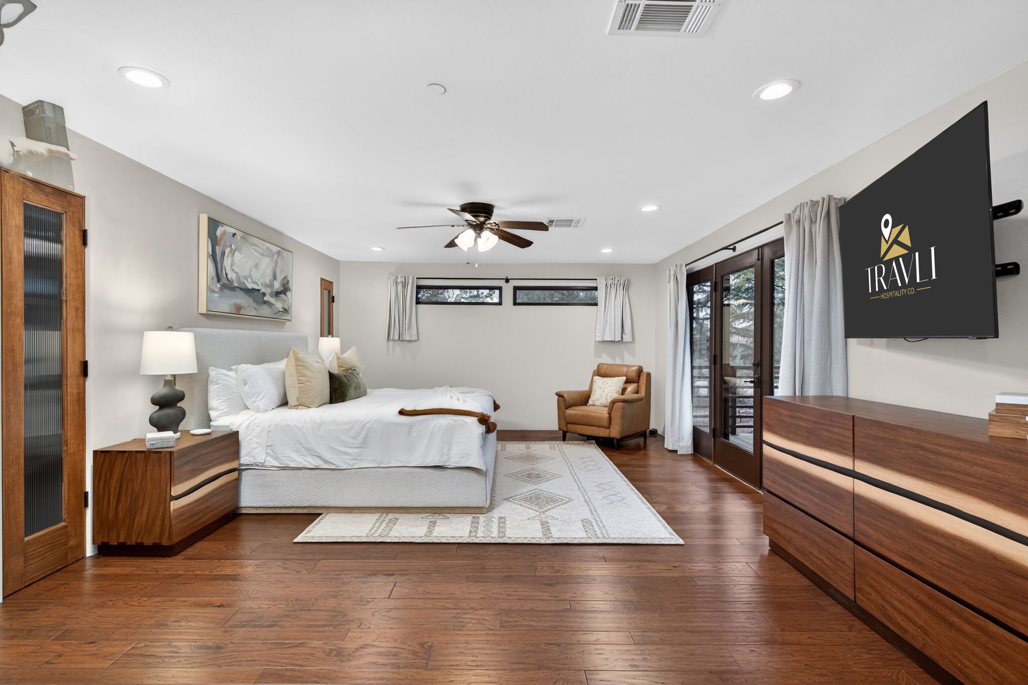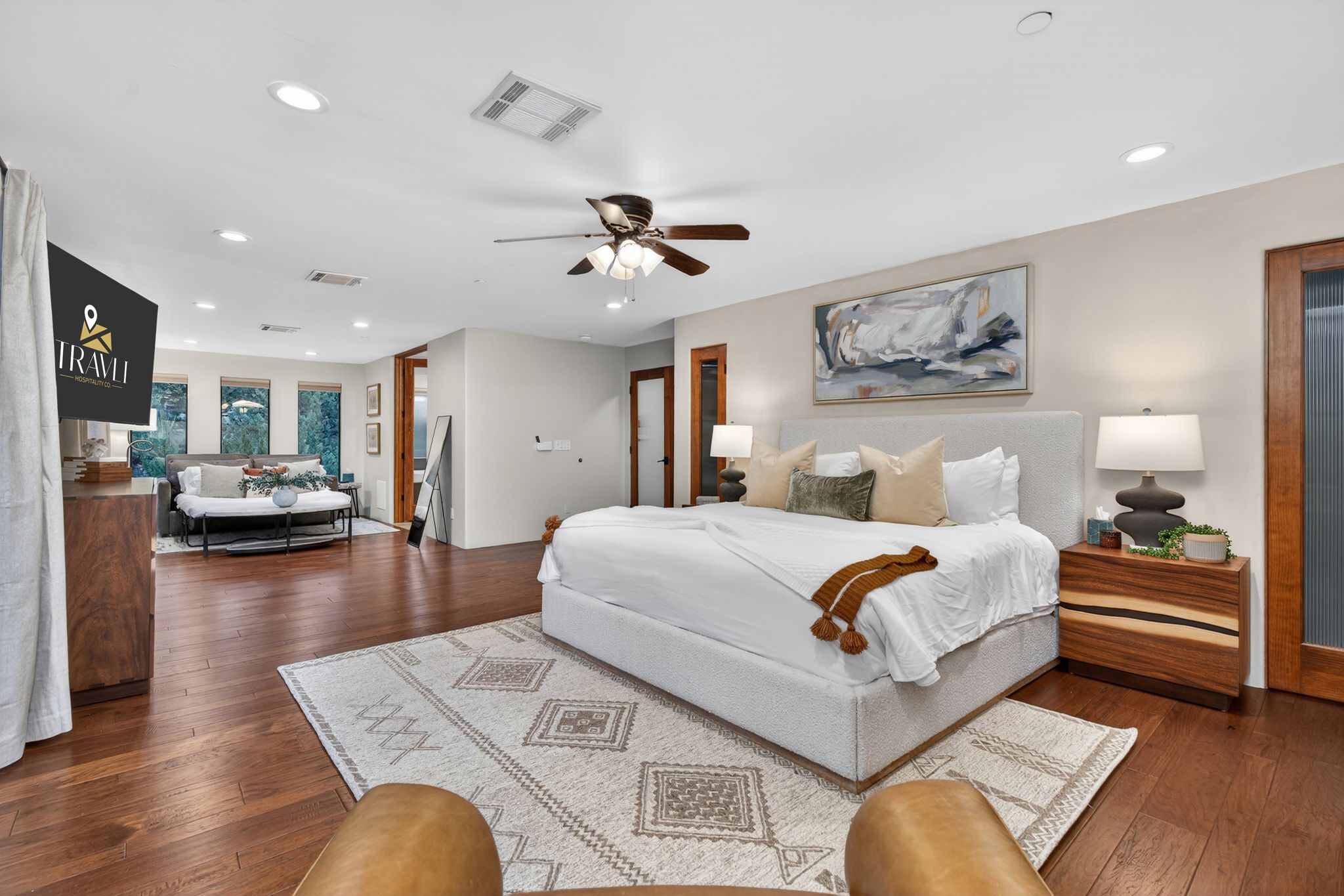 Spanning multiple levels with three bedrooms plus a private detached casita, the home comfortably accommodates groups seeking space, privacy, and elevated design. Three king suites anchor the experience, complemented by two queen sofa sleepers for additional flexibility. The primary suite is a showstopper, occupying nearly half of the entire upper floor with an open, airy layout, a king bed positioned for unobstructed Chapel views, a lounge seating area, and direct access to a full-length private deck that frames Sedona’s most iconic scenery. The en-suite spa bathroom completes the experience with an oversized soaking tub and an extra-large walk-in shower, creating a true private retreat within the retreat.