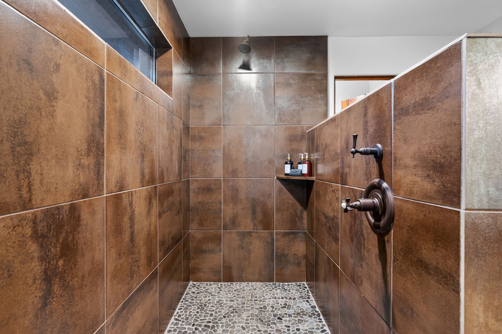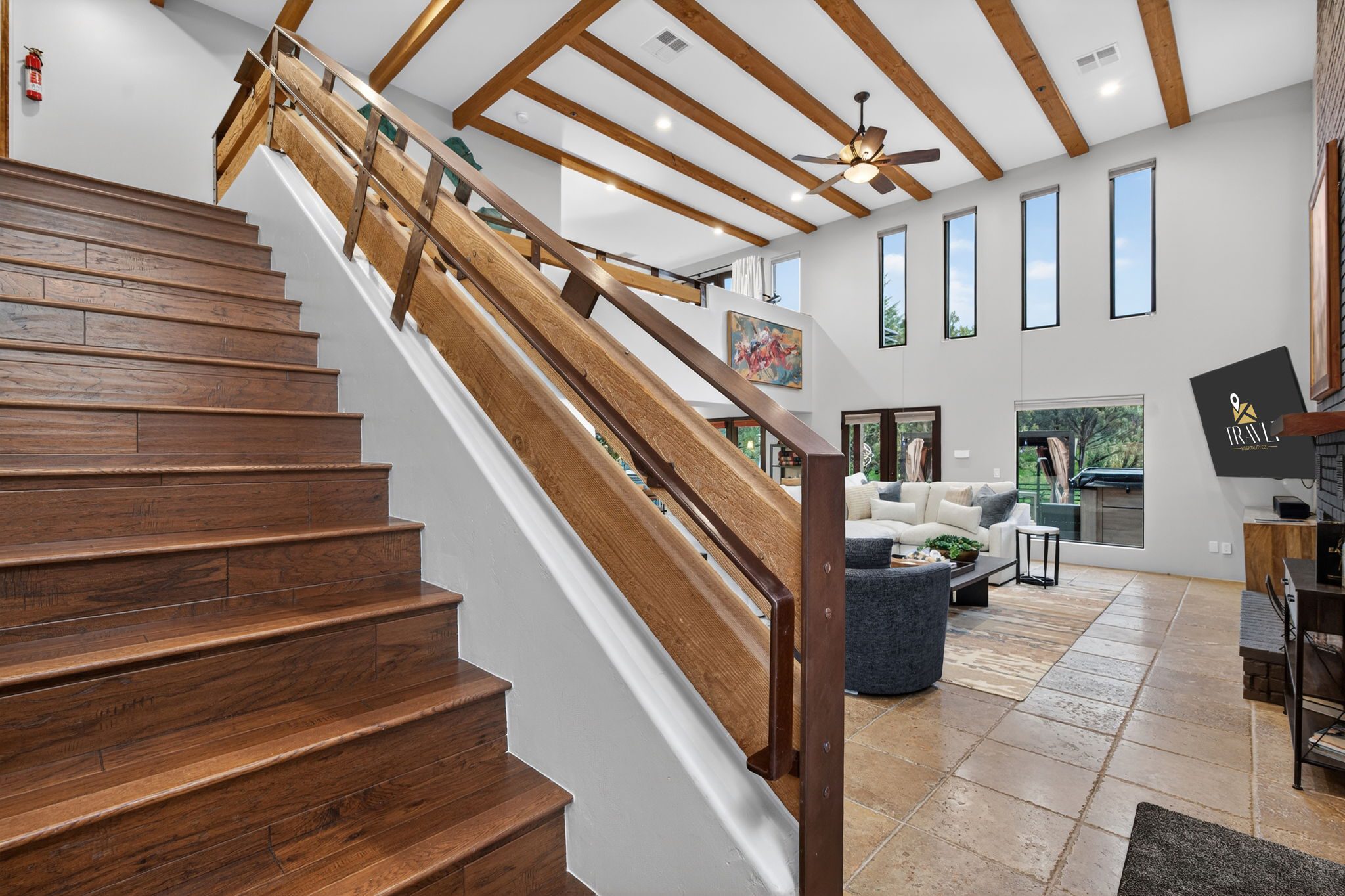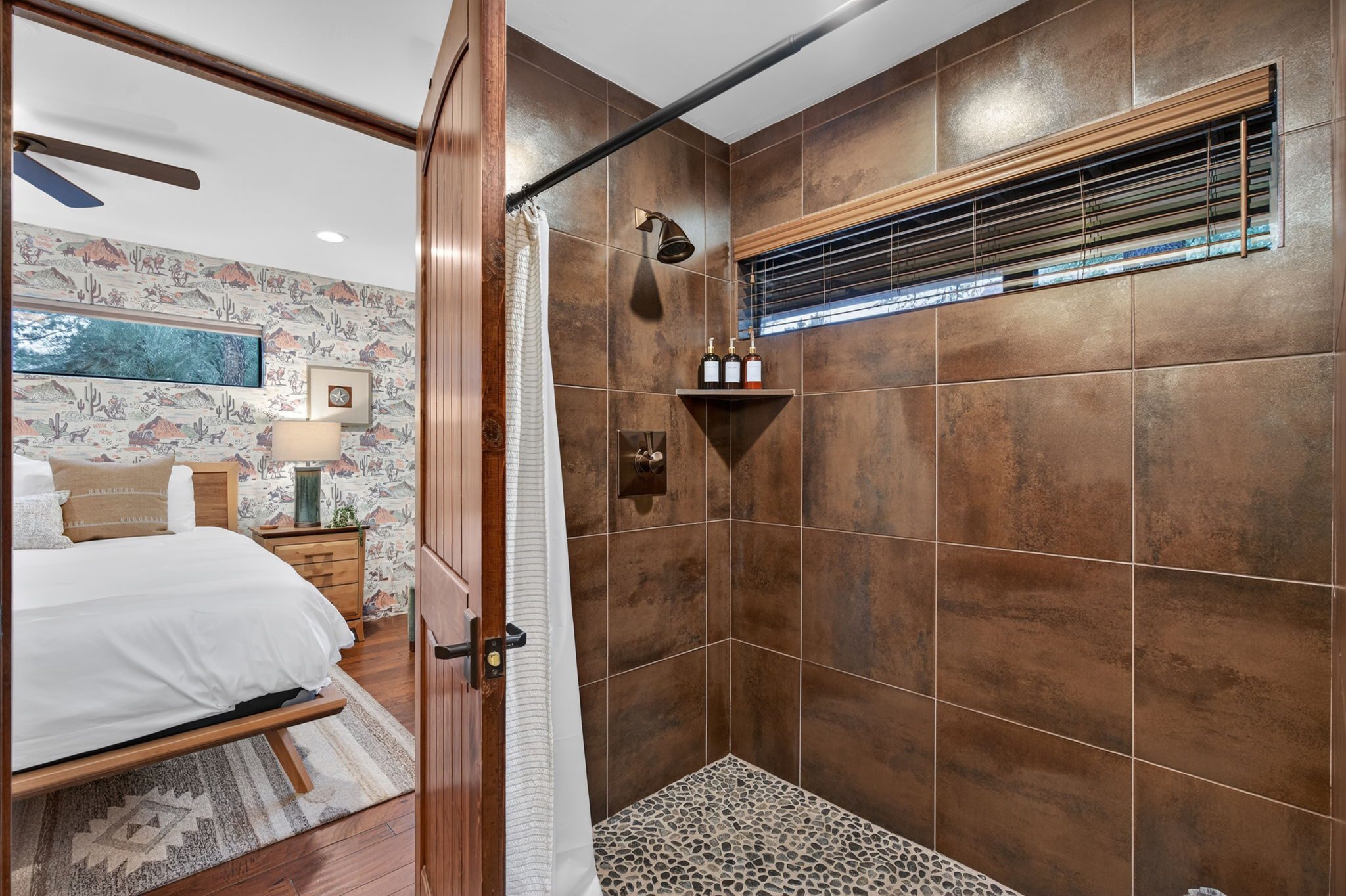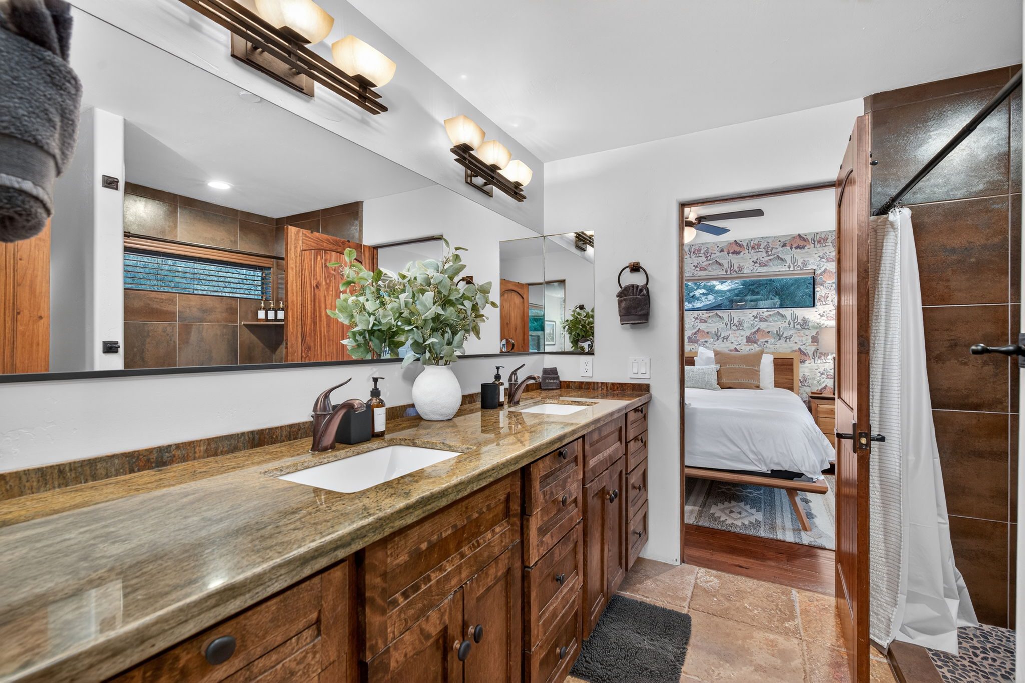 The upper loft adds another layer of comfort and entertainment, featuring a cozy lounge, a digital game table, and wrap-around deck access on two sides—perfect for quiet moments, late-night conversations, or simply soaking in the majestic red rock surroundings. On the main level, two additional king suites are connected by a beautifully appointed Jack-and-Jill bath with a large dual-sink vanity and an open, modern tiled shower, offering both privacy and convenience for guests traveling together.